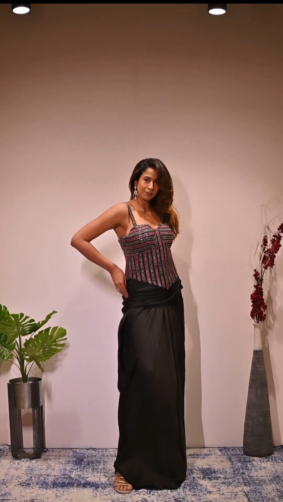 Nikki Deol in Black Embellished Short Jacket and corset with Draped Skirt Set