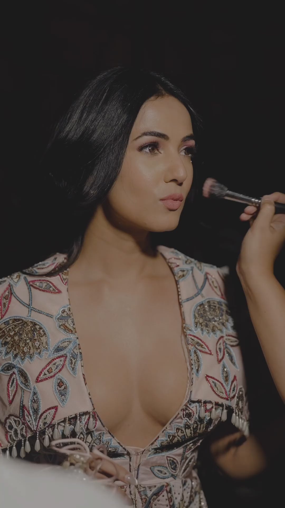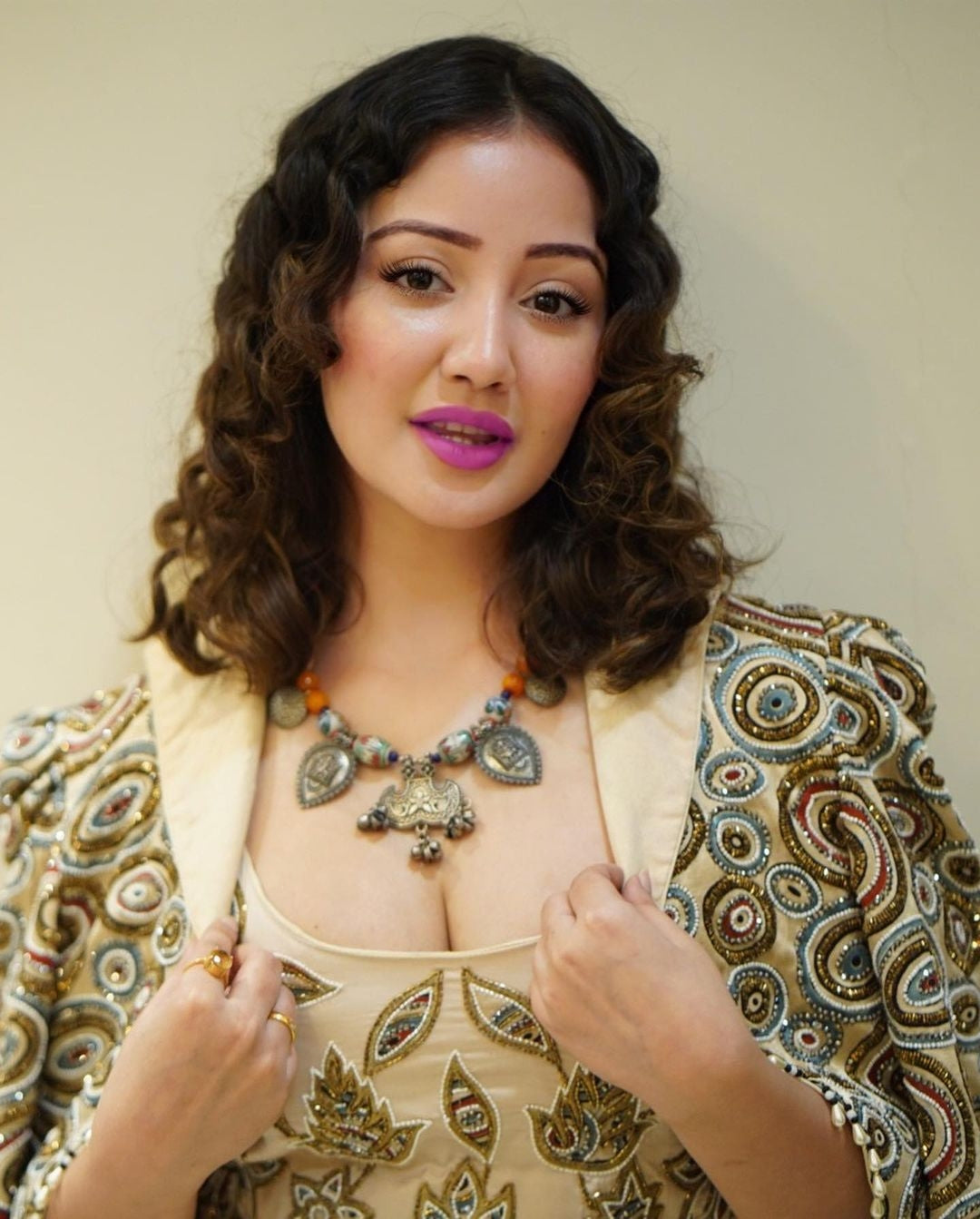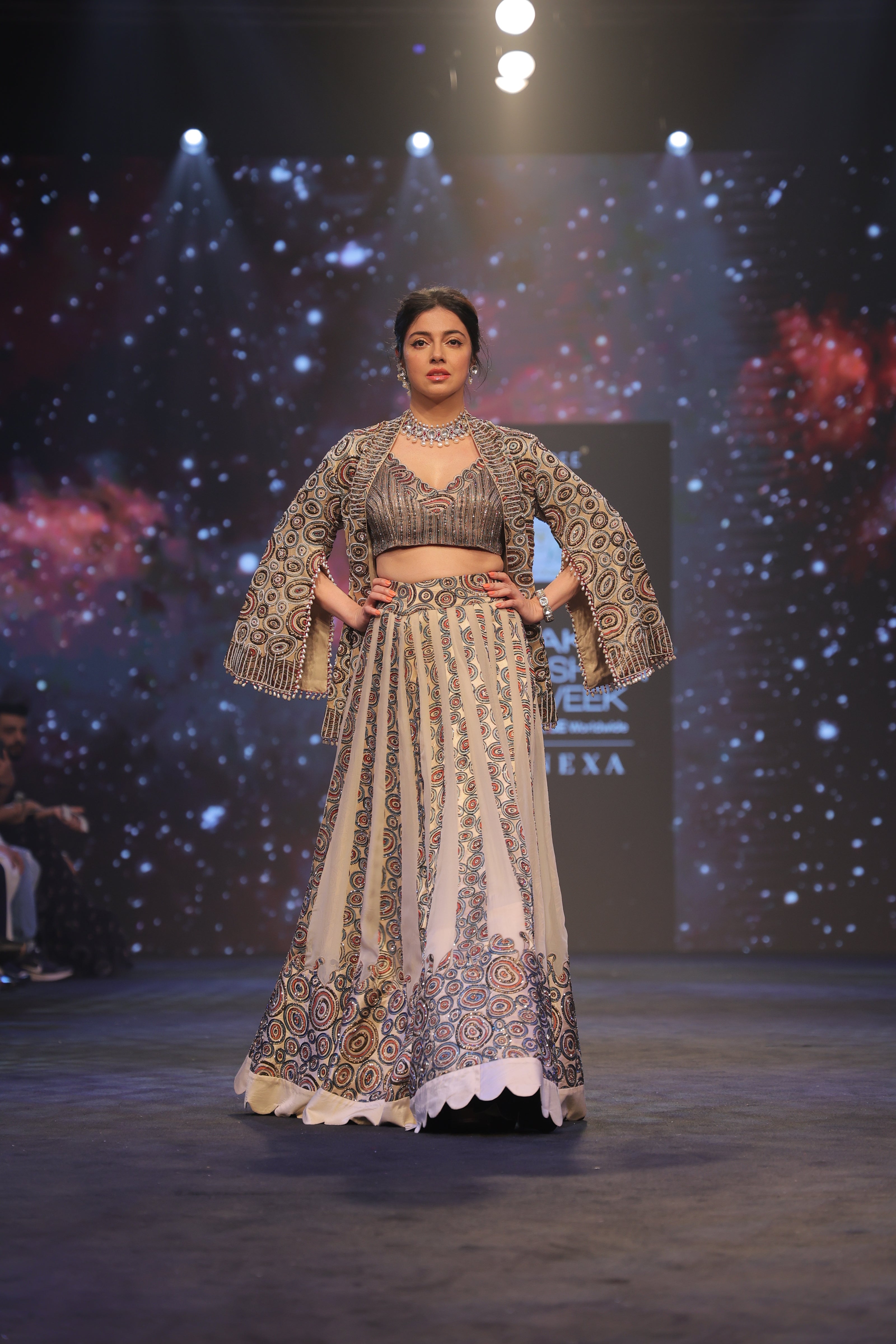 Parul Gulati in Peachy Pink Bralette and flare pants with embellished ajrakh patchworked jacket