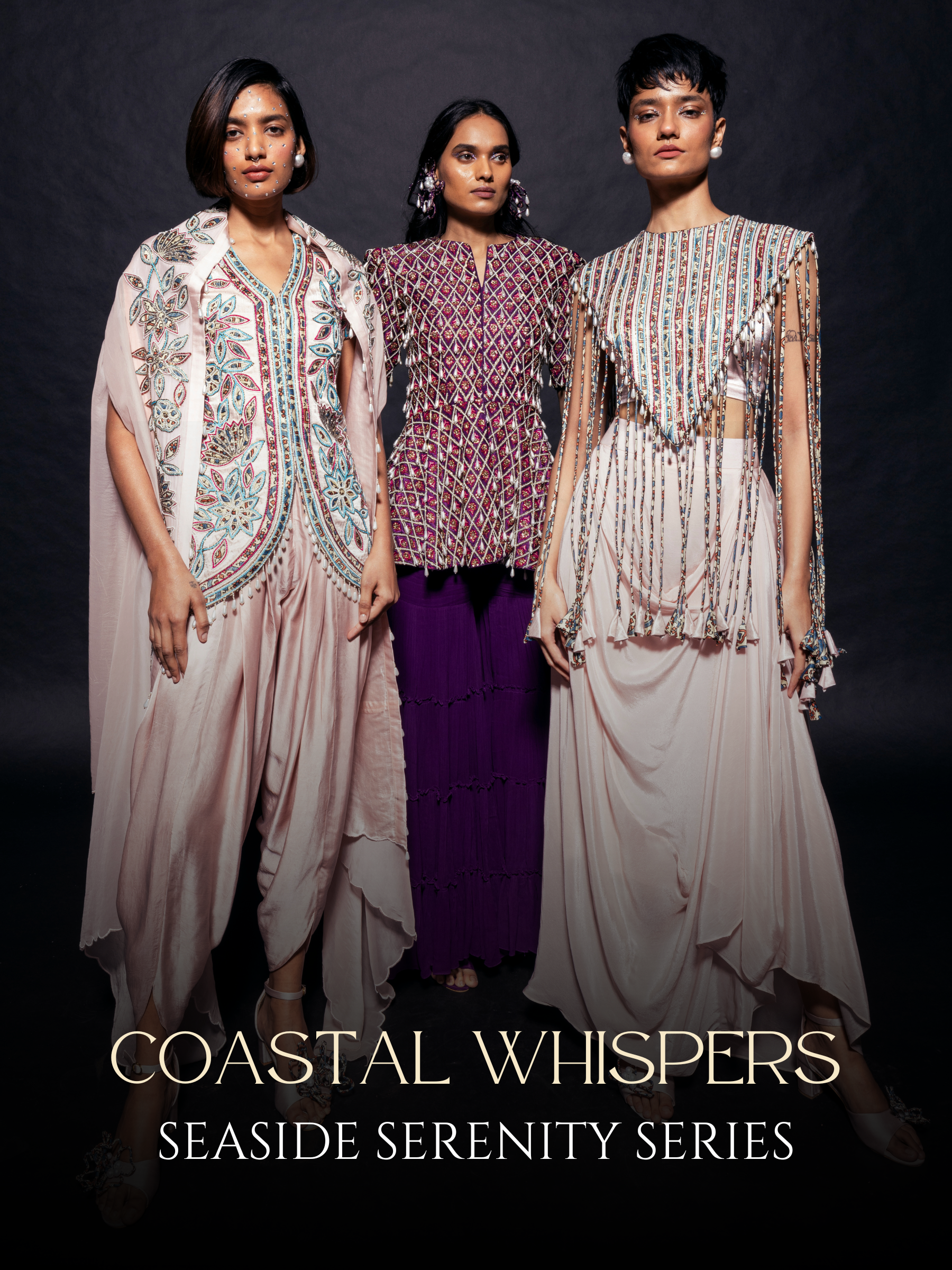 Peachy Pink ajrakh stripwork jacket paired up with Peachy pink bralette and drape dhoti skirt