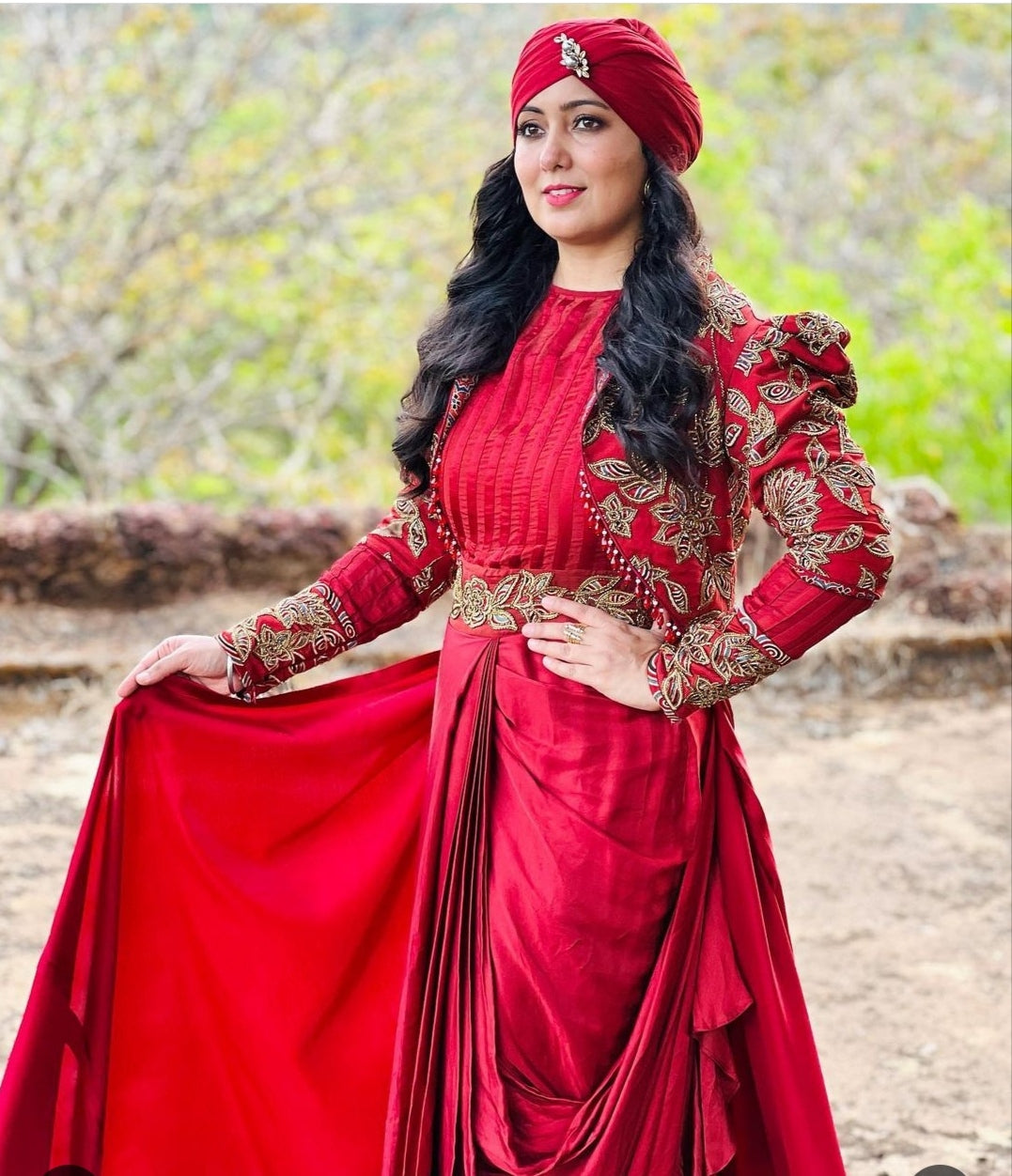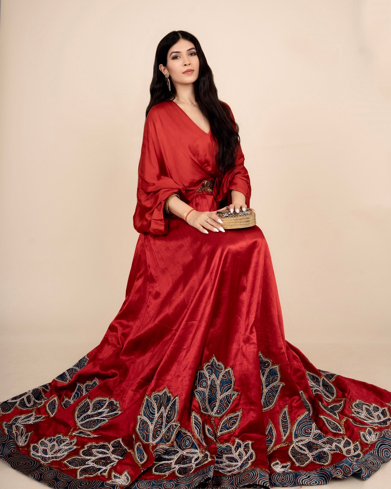 Peachy pink Ajrakh embroidered blouse paired up with Dhoti and ruffled dupatta