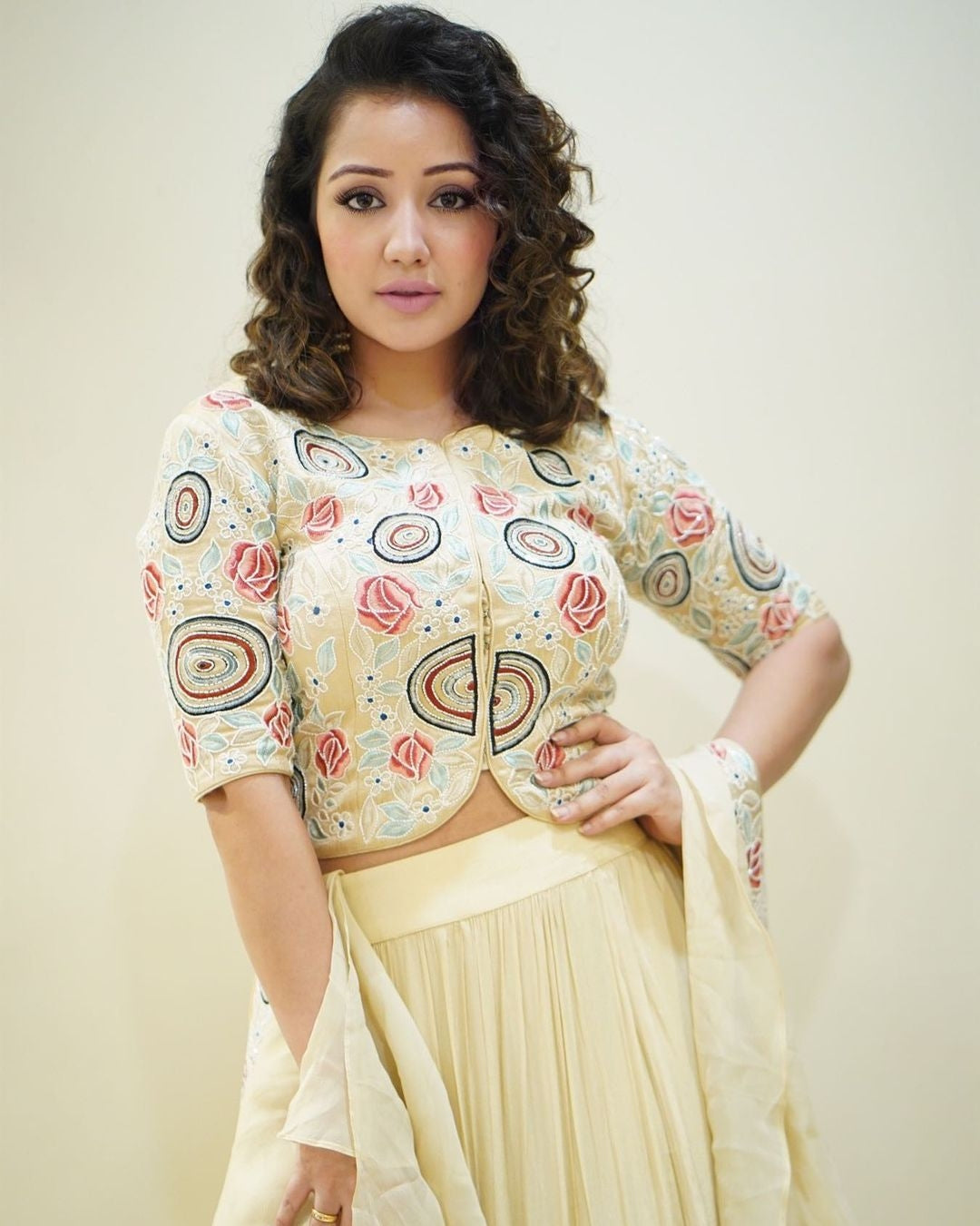 Sonal Chauhan in Peachy Pink Mashru Silk Ajrakh Hand Work Capelet Top And Sharara Set