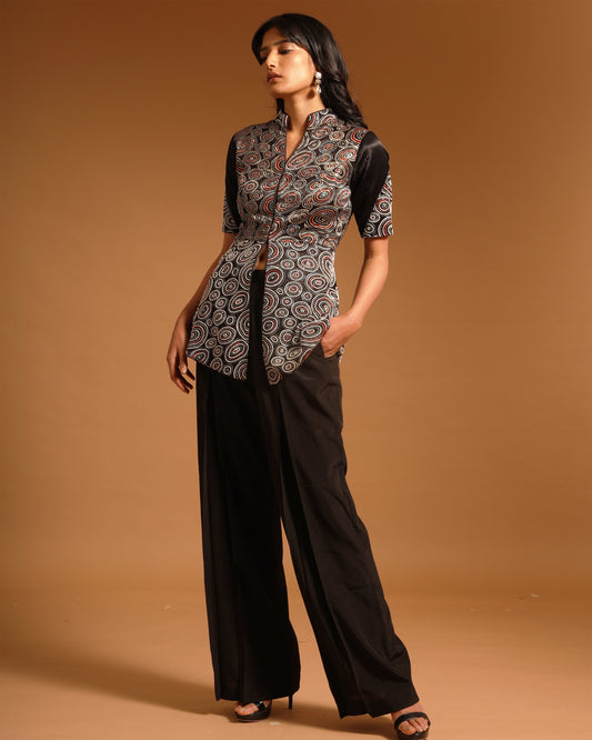 Black Ajrakh embellished jacket with black peplum top and pleated pants