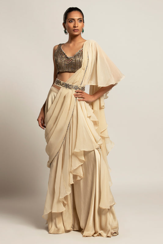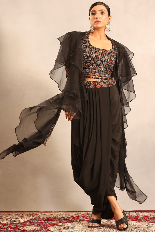 Black ajrakh embellished blouse with drape skirt and ruffle dupatta
