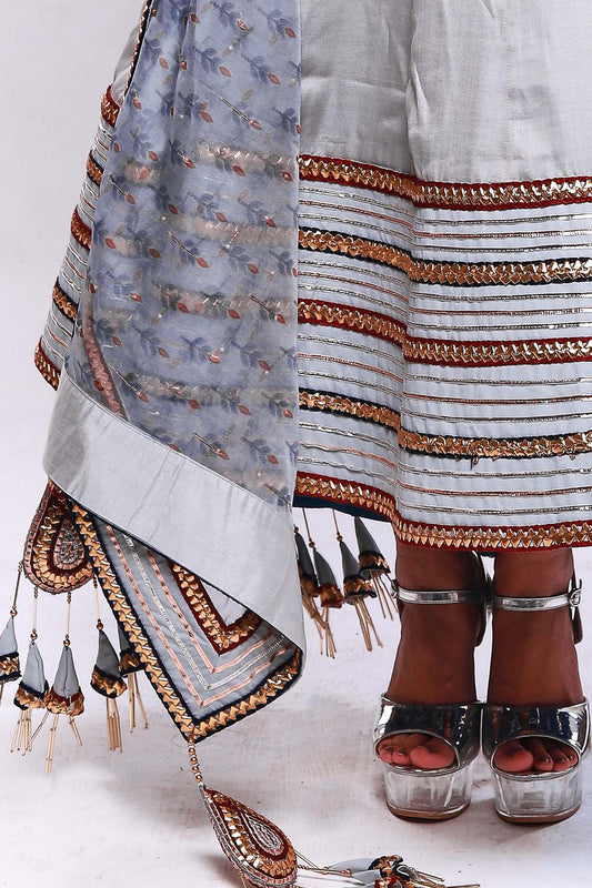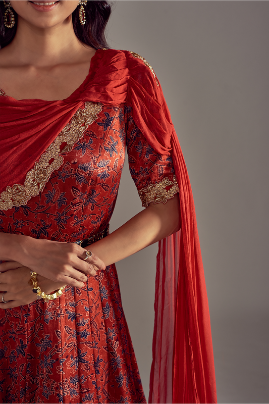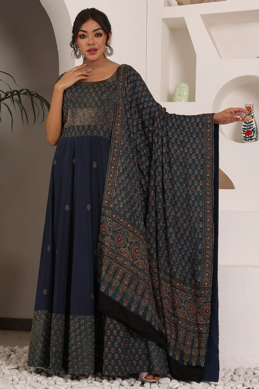 Dark Blue embroidered ajrakh anarkali with embellished dupatta