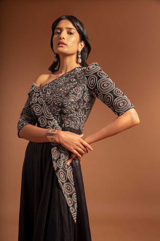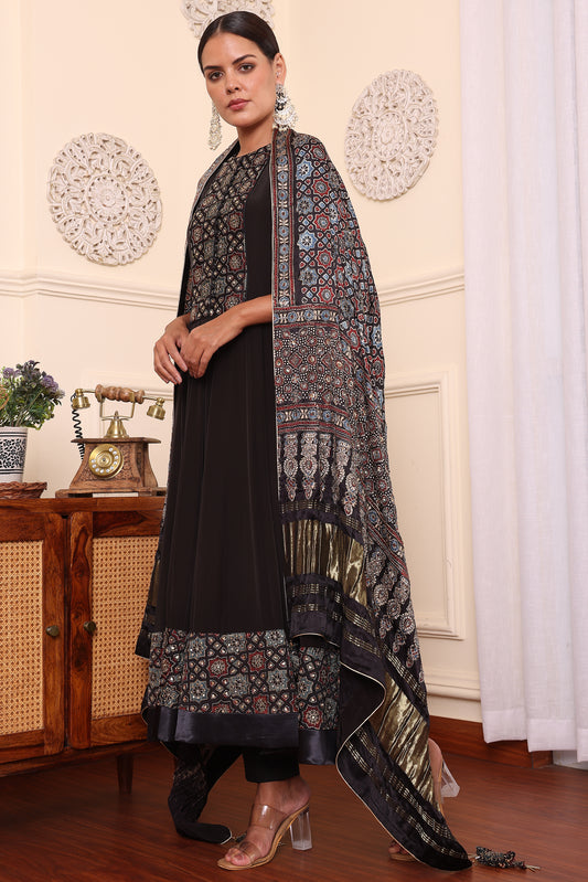 Black Embellished Ajrakh Anarkali With Pant And Dupatta