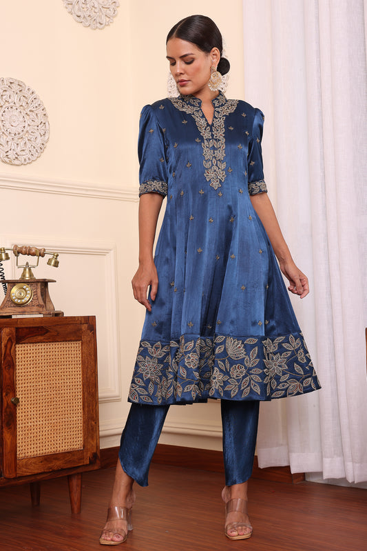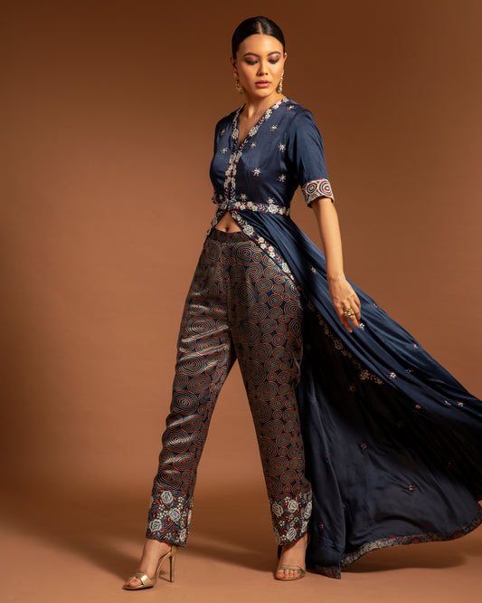 Cobalt Blue Ajrakh Patchwork Anarkali With Tulip pant and Dupatta