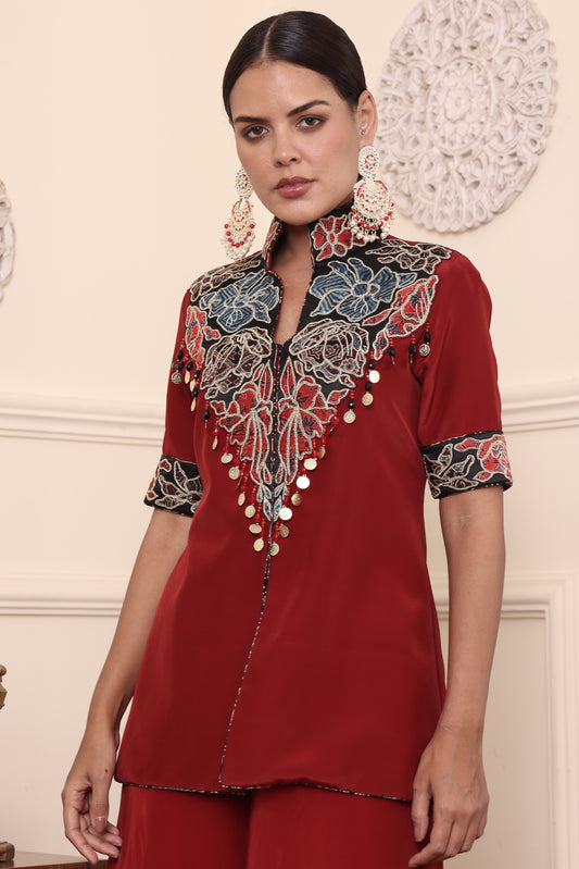 Red Ajrakh Patchwork Jacket With Flair Pants