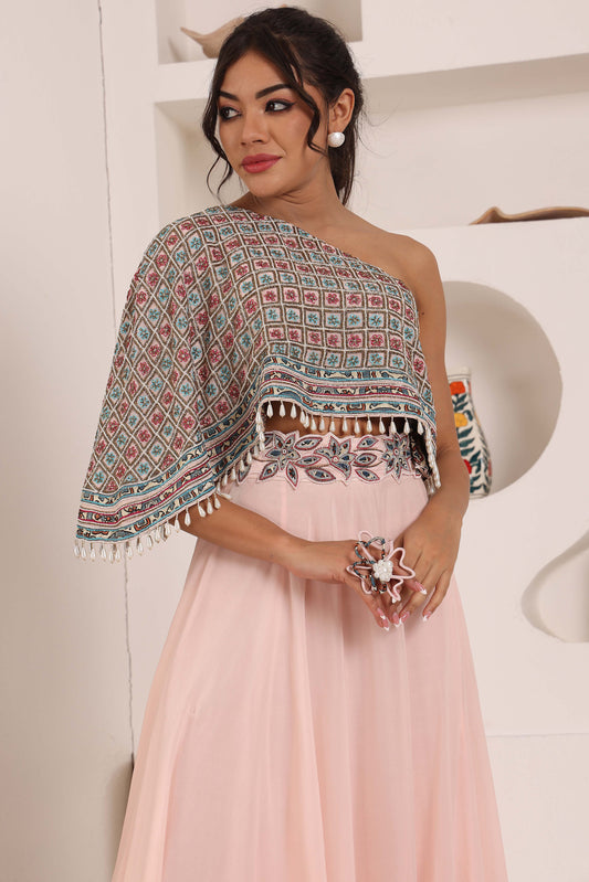 Beige Fully Embellished Jacket with Draped Skirt and Ruffle Dupatta Set