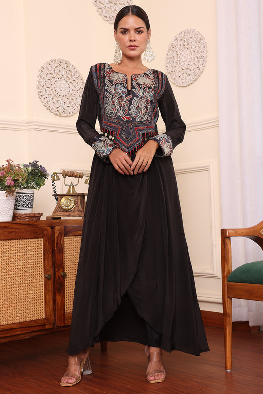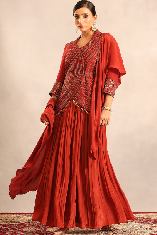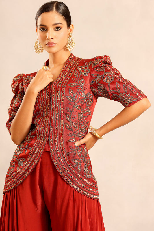 Red ajrakh patchwork fully embellished jacket with side cowl pants