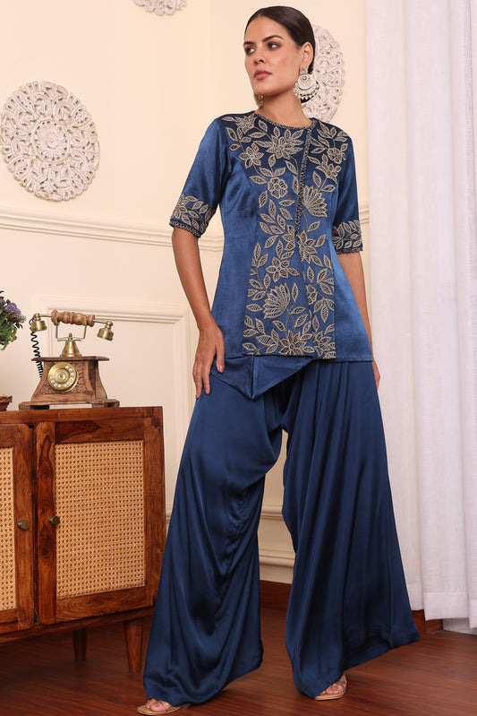 Cobalt Blue Embroidered Jacket With Asymmetric Pants