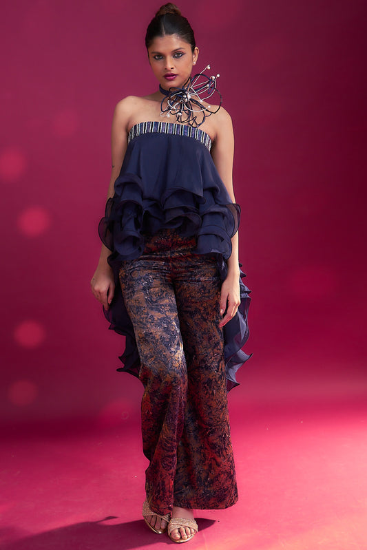 Deep blue ajrakh embellished jacket with embellished brallete and flare pants