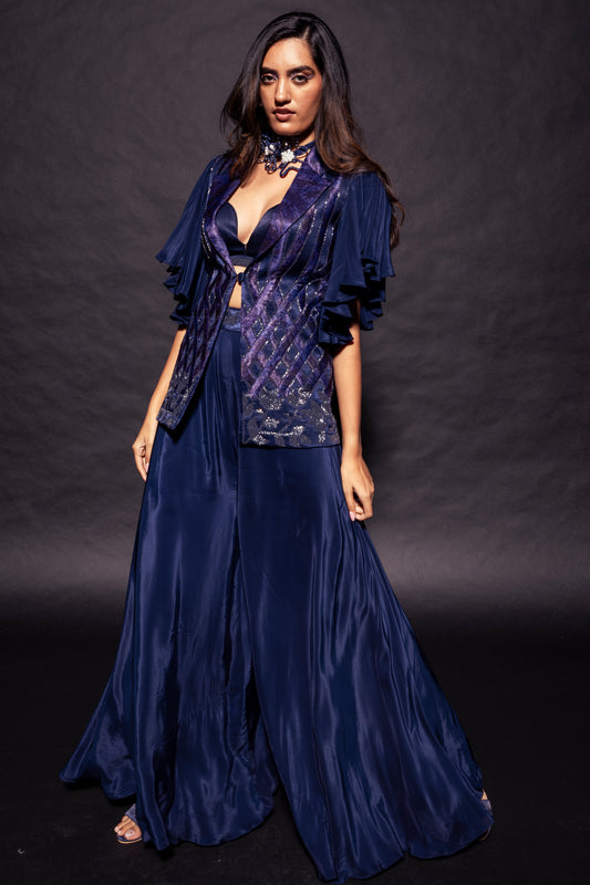 Deep blue ajrakh embellished jacket with embellished brallete and flare pants