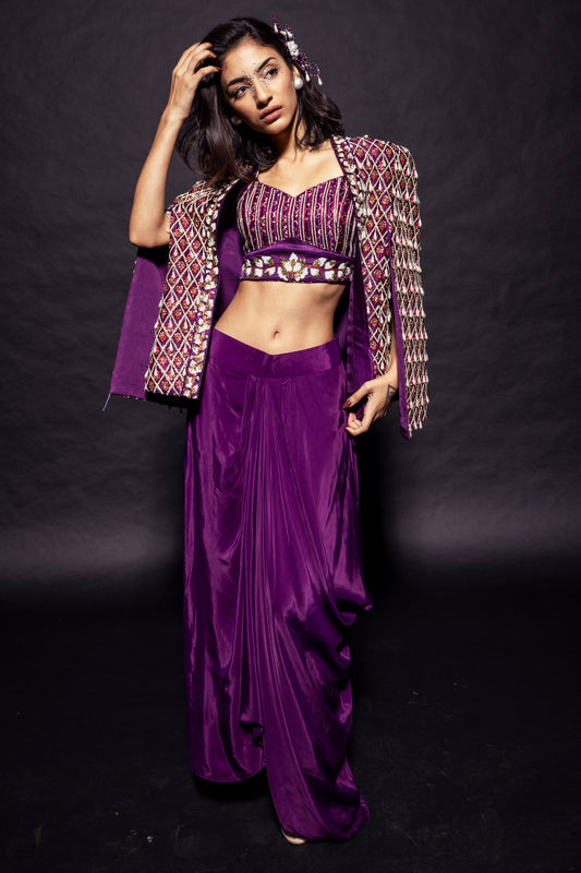 Dark purple Ajrakh stripwork capelet with purple bralette and drape skirt