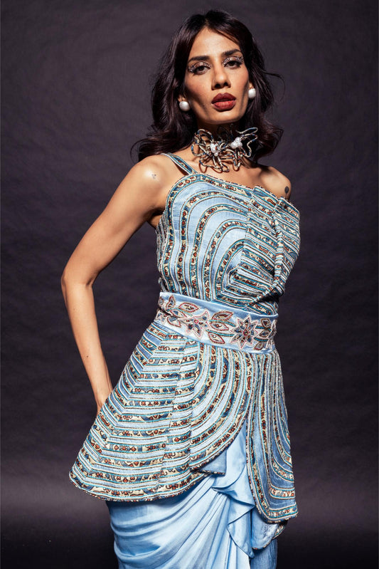 Powder blue ajrakh embroidered assymetric peplum top with Drape dhoti skirt