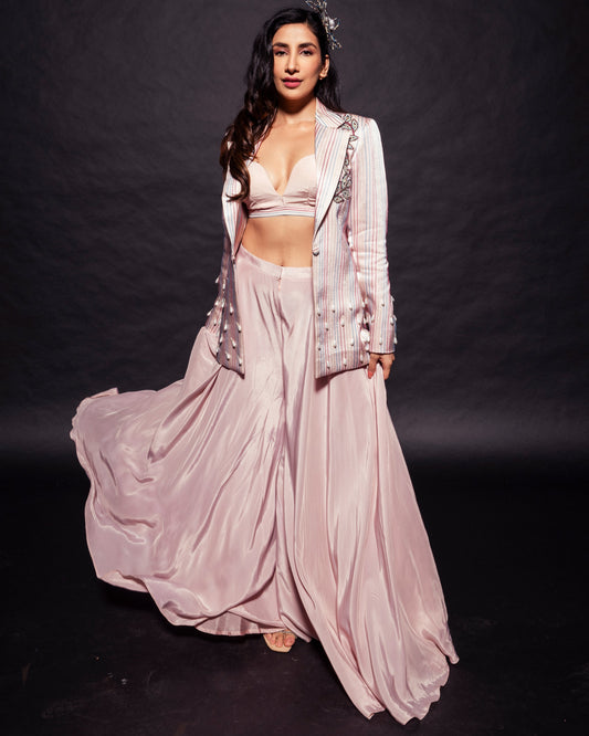Parul Gulati in Peachy Pink Bralette and flare pants with embellished ajrakh patchworked jacket