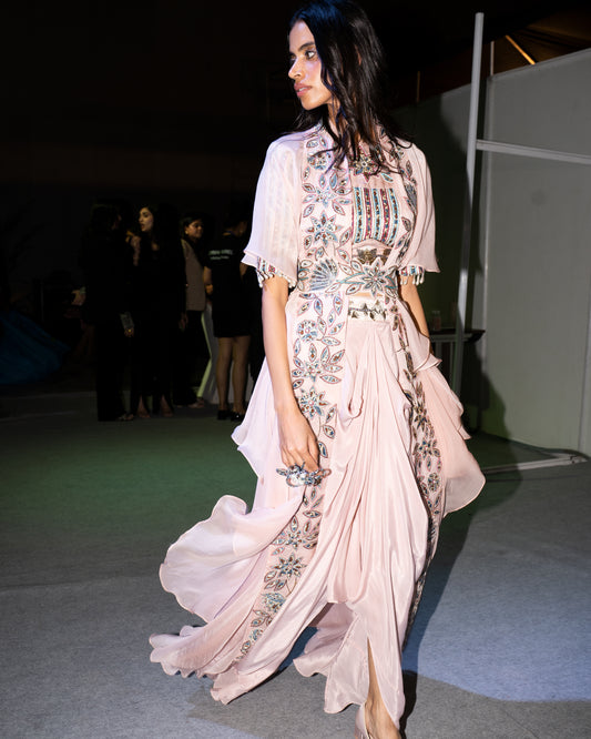 Peachy Pink ajrakh embellished jacket with cape dupatta and dhoti