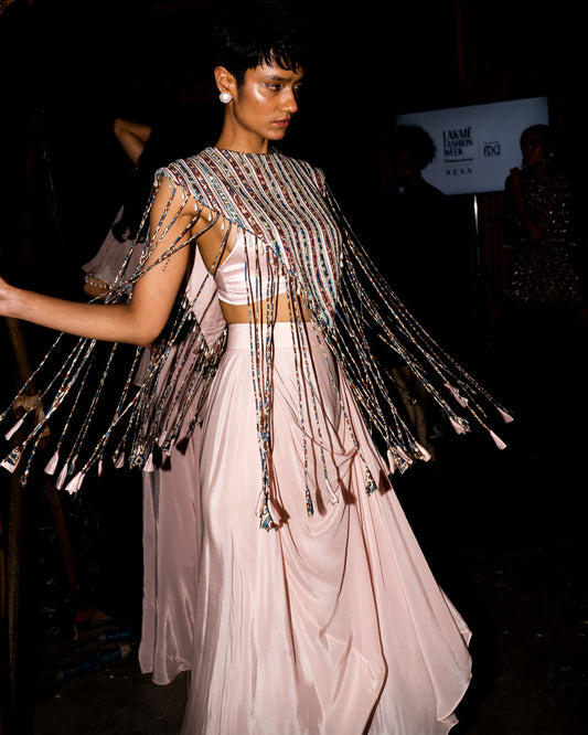 Peachy Pink ajrakh stripwork jacket paired up with Peachy pink bralette and drape dhoti skirt