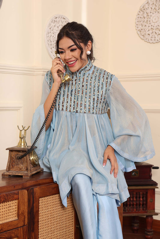 Powder Blue ajrakh embellished yoke top and Drape dhoti set