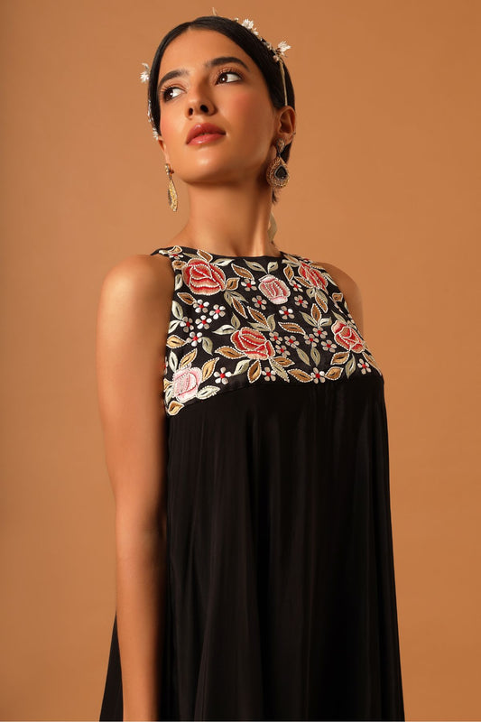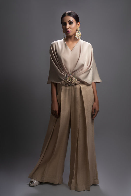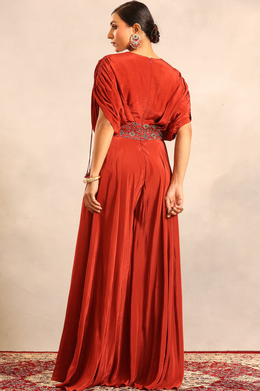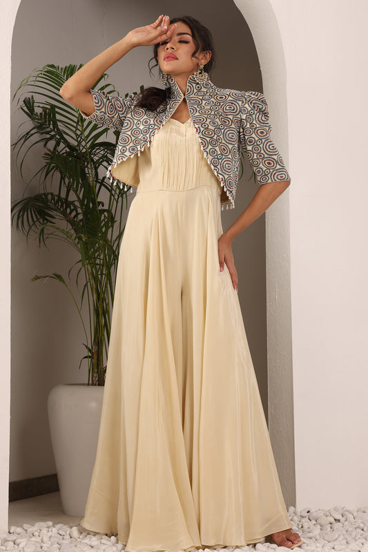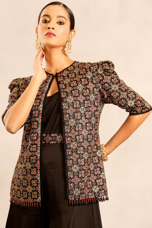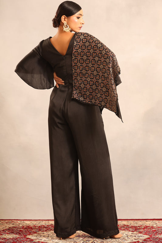 Black side cowl jumpsuit with Ajrakh embellished jacket and waistband