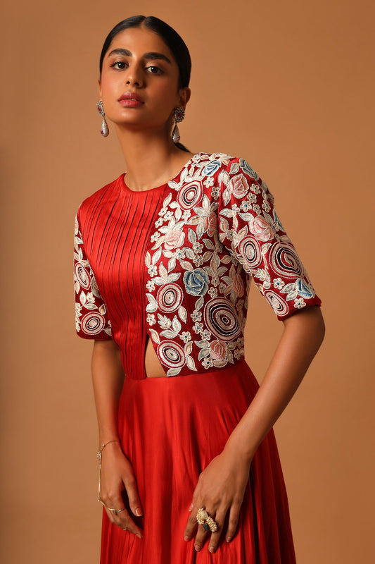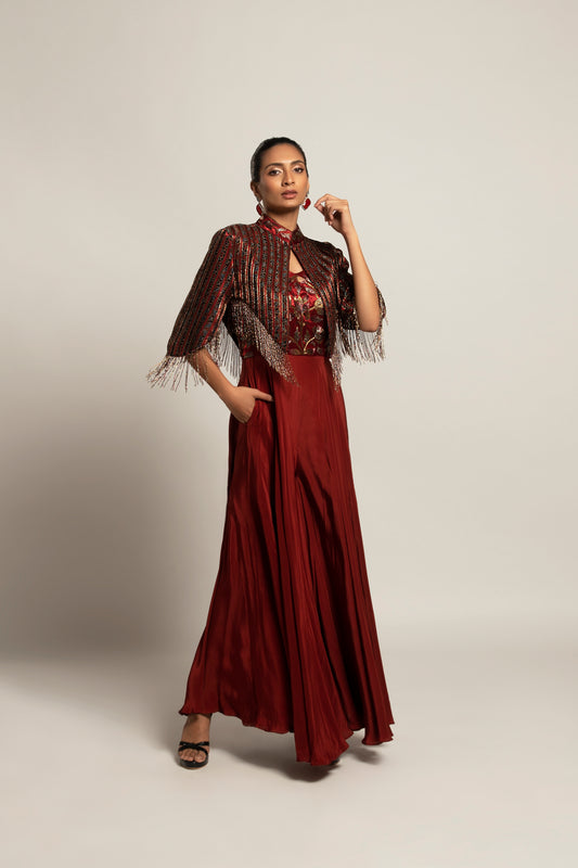 Priya Raj Mani in Maroon ajrakh embroidered gathered gown