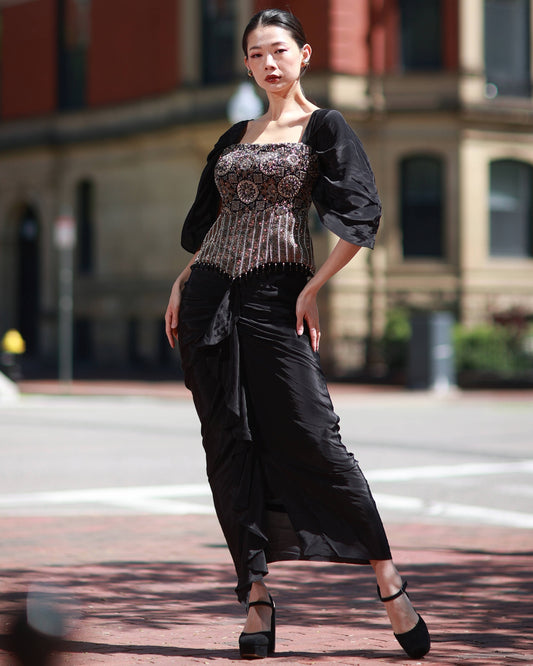 Black ajrakh embellished yoke butterfly sleeve gathered dress