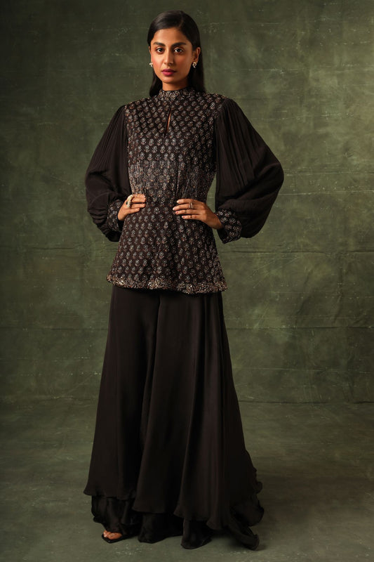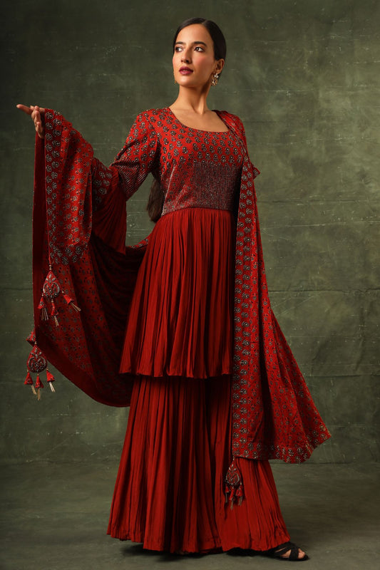 Red ajrakh gathered kurta and sharara with ajrakh dupatta
