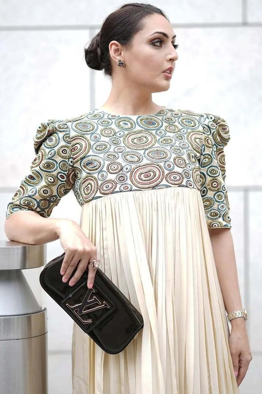 Treasure Muse Nidhi Agarwal in Beige Embroidered Balloon Sleeve Dress