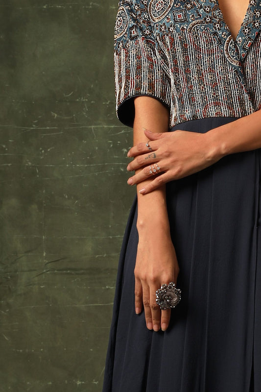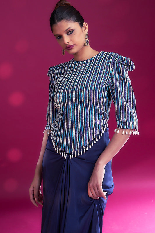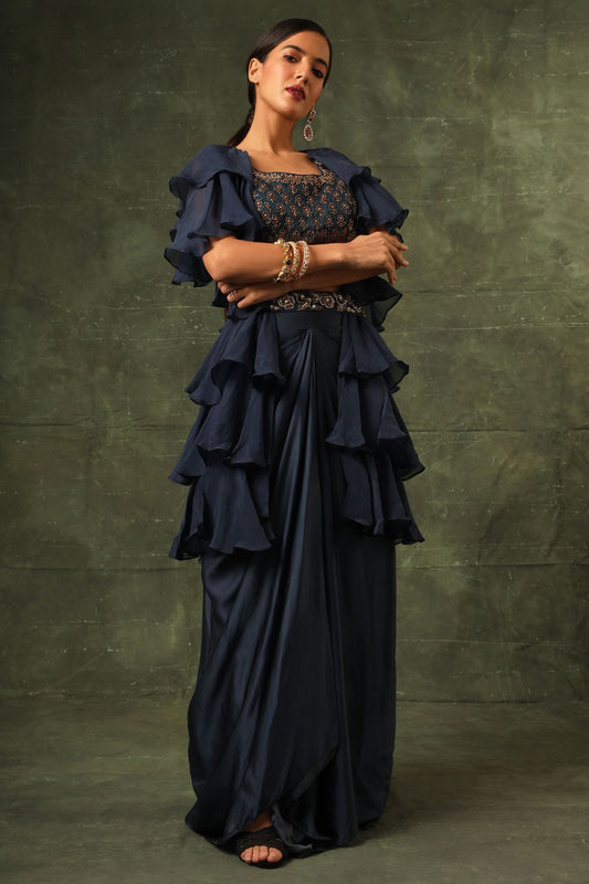 Blue Ajrakh blouse and layered jacket with embroiderd waisrband and drape dhoti