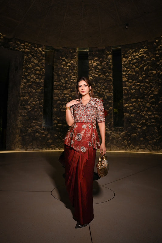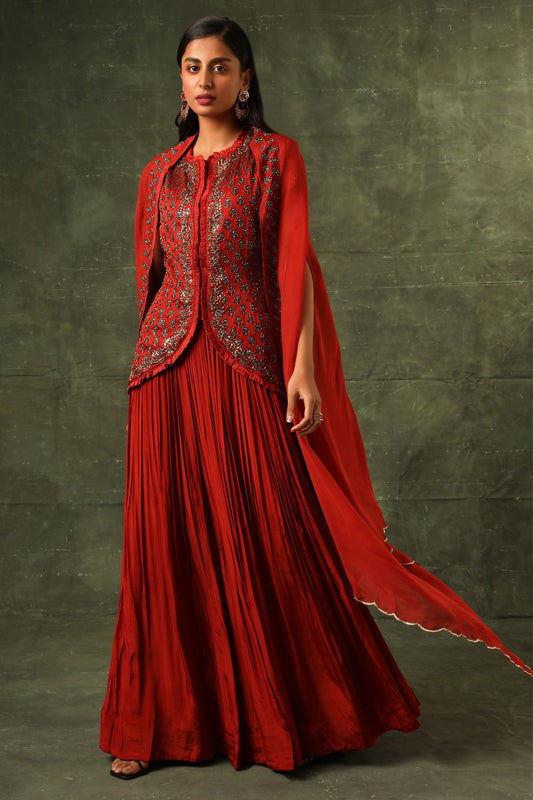 Red Ajrakh jacket with gathered skirt and cape dupatta