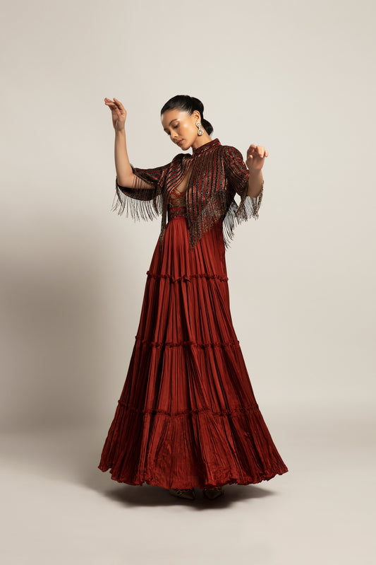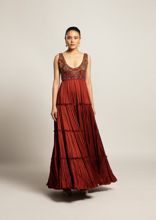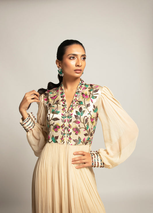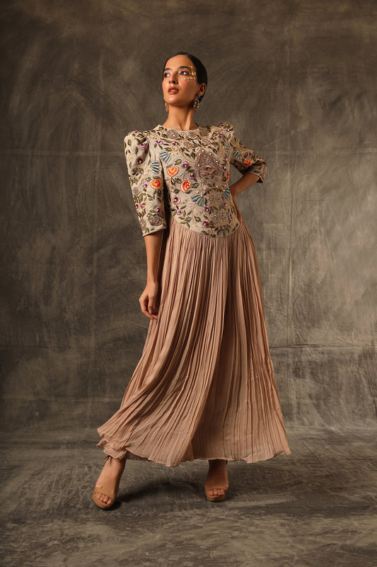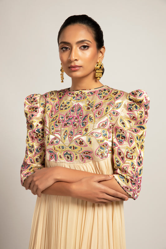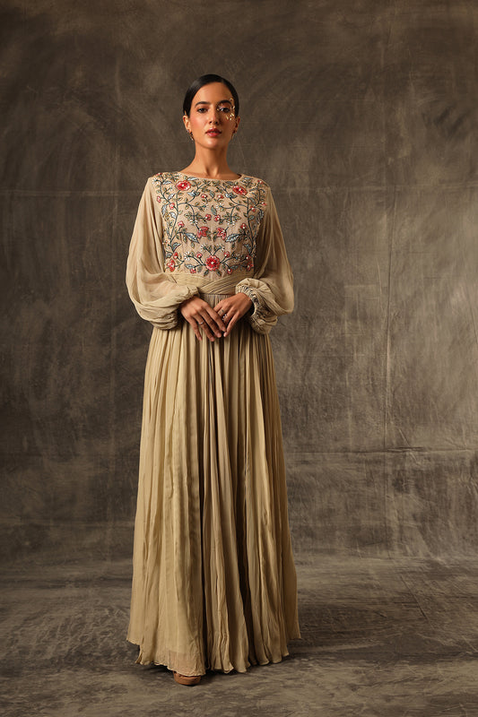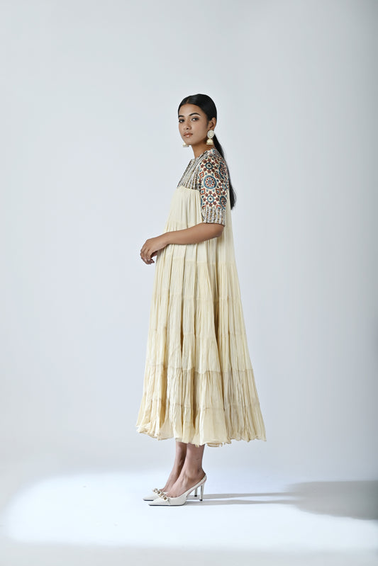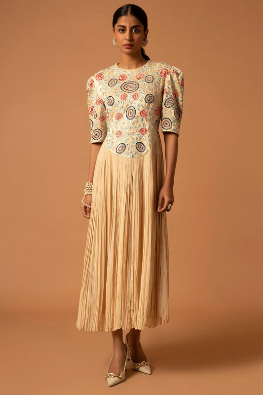 Beige Pure Muslin Silk Gathered A-Line Dress