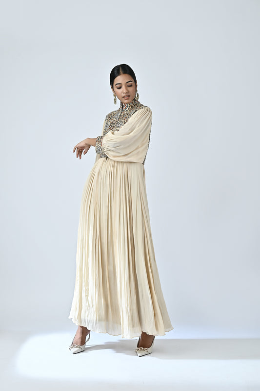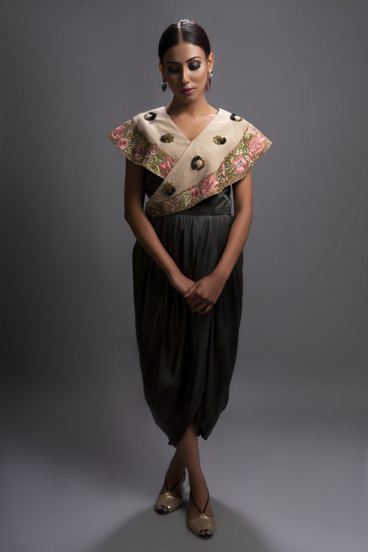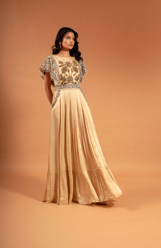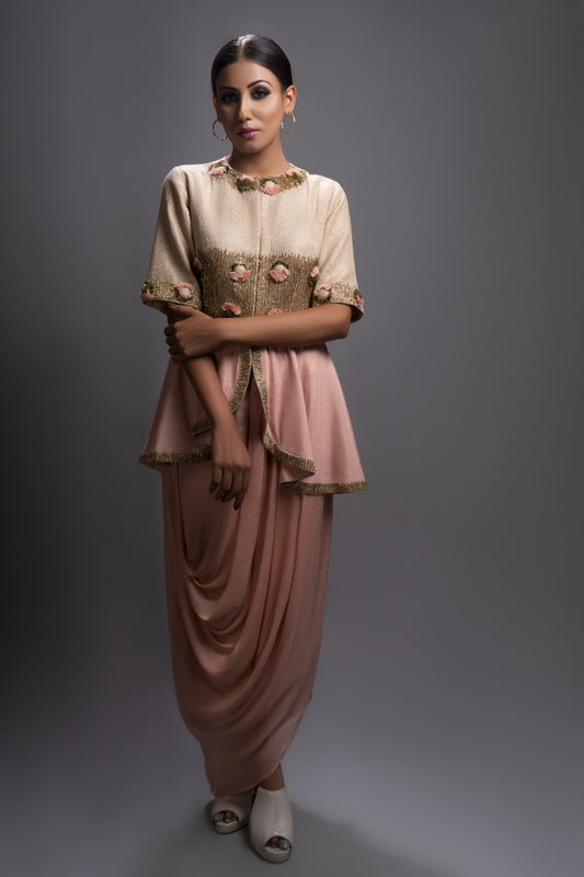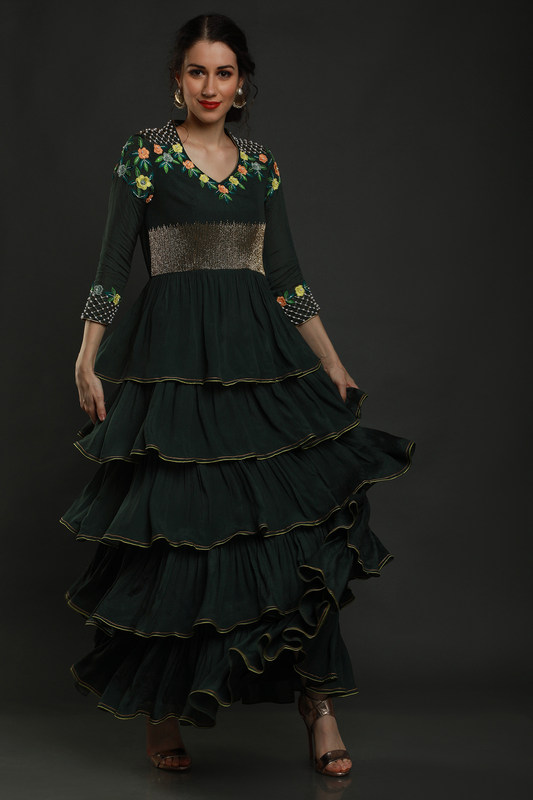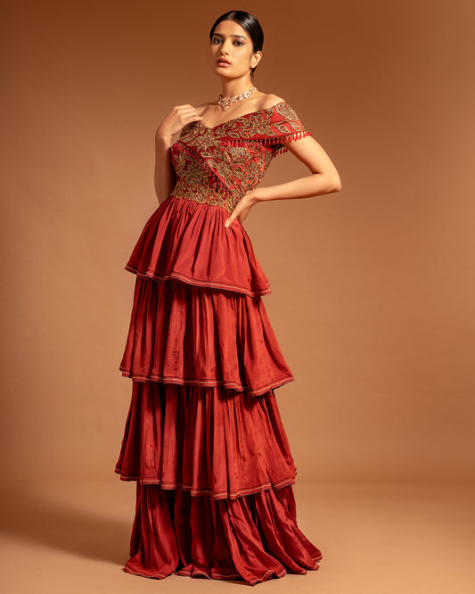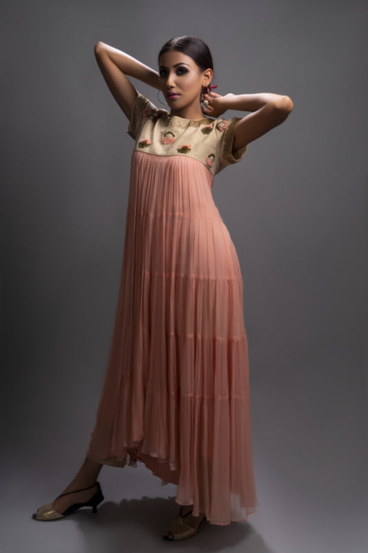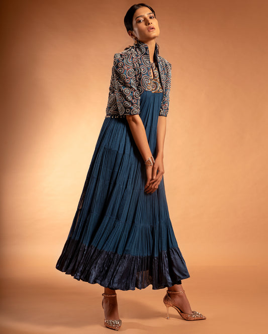 Cobalt Blue tiered Dress with Ajrakh jacket.