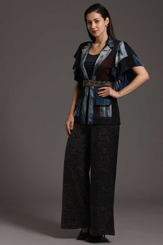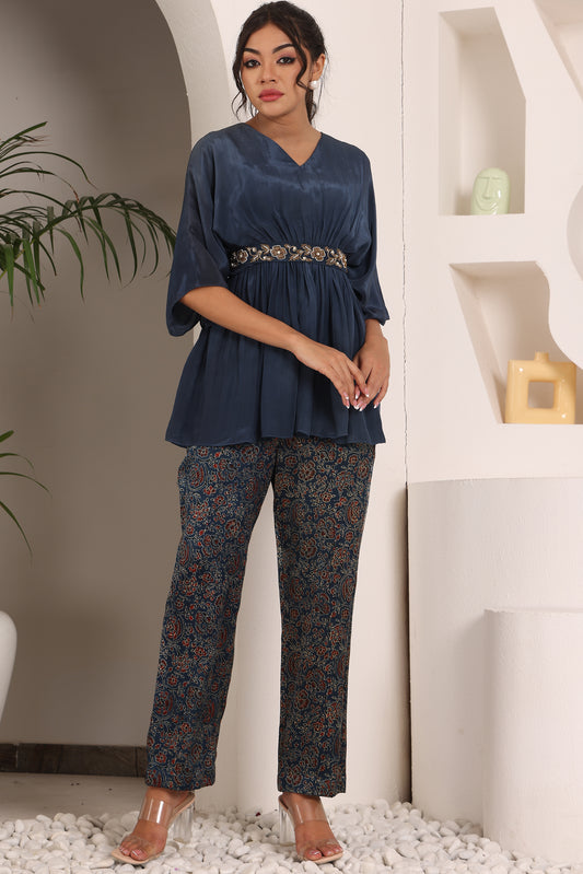Blue gathered top with Ajrakh pants and embellished waistbelt