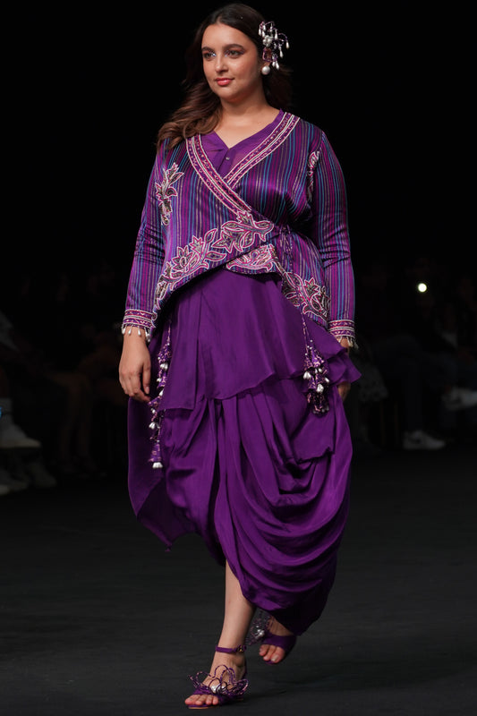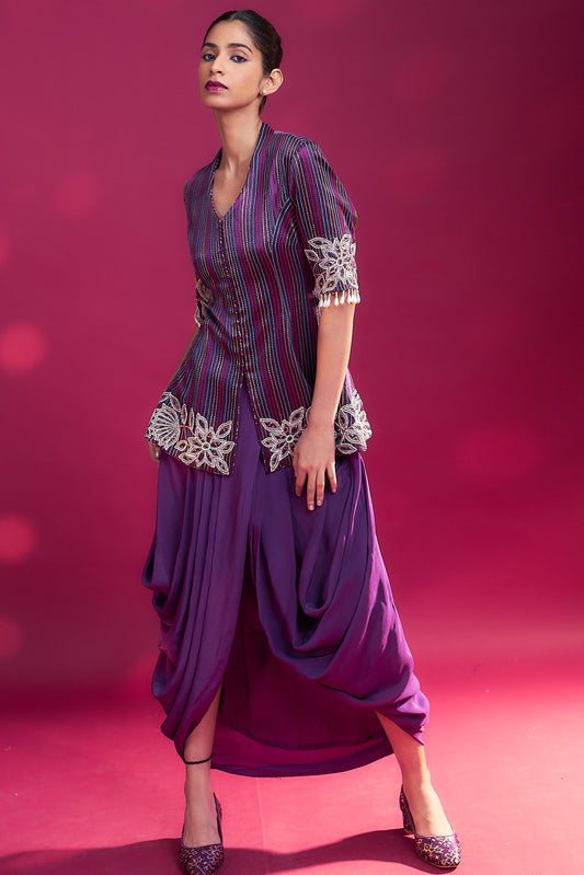 Dark Purple fully patchedworked angarkha jacket with drape dhoti skirt
