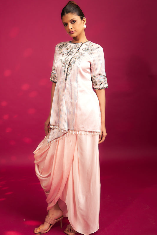 Peachy pink Embellished ajrakh jacket with drape dhoti skirt