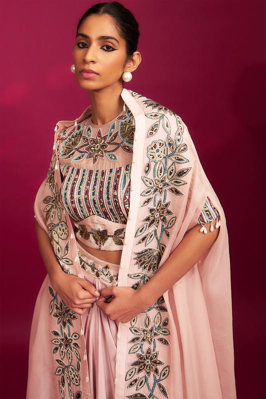 Peachy pink embellished ajrakh blouse with embroidered cape and dhoti