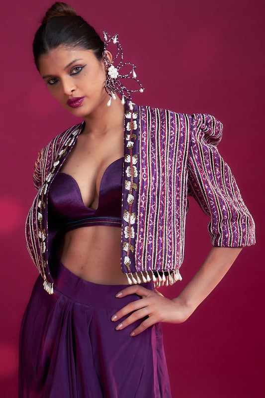 Dark purple Ajrakh embroidered jacket with bralette and dhoti skirt