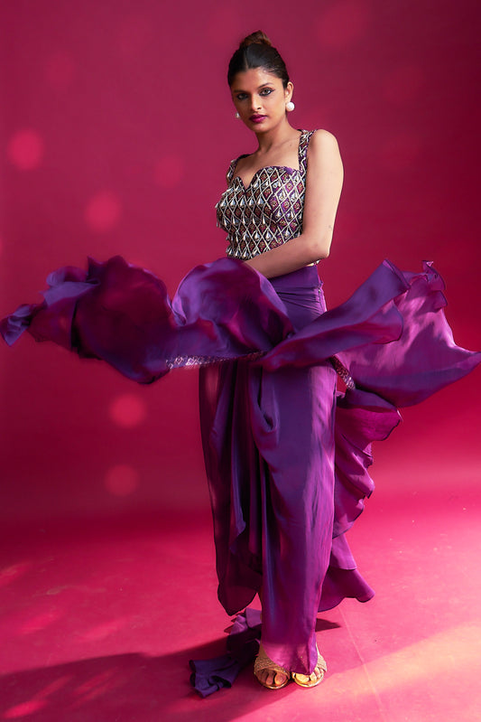 Dark purple ajrakh embellished blouse with drape skirt and ruffled dupatta