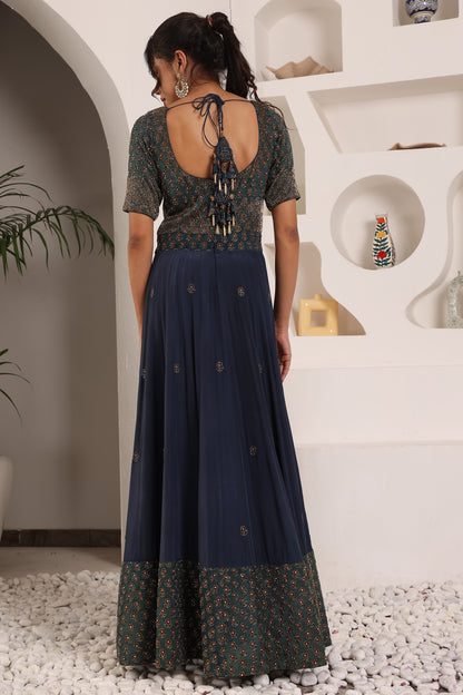 Dark Blue embroidered ajrakh anarkali with embellished dupatta