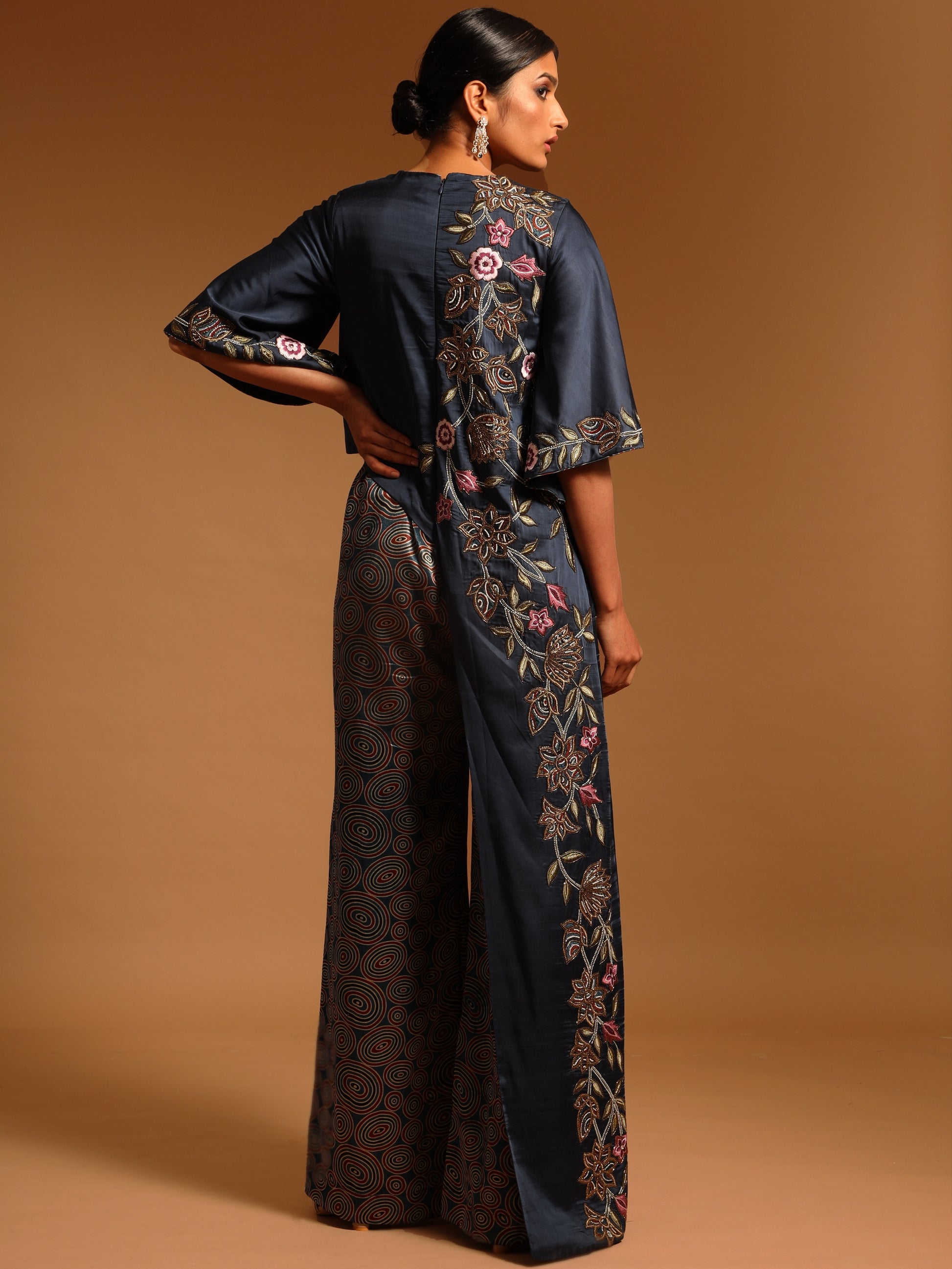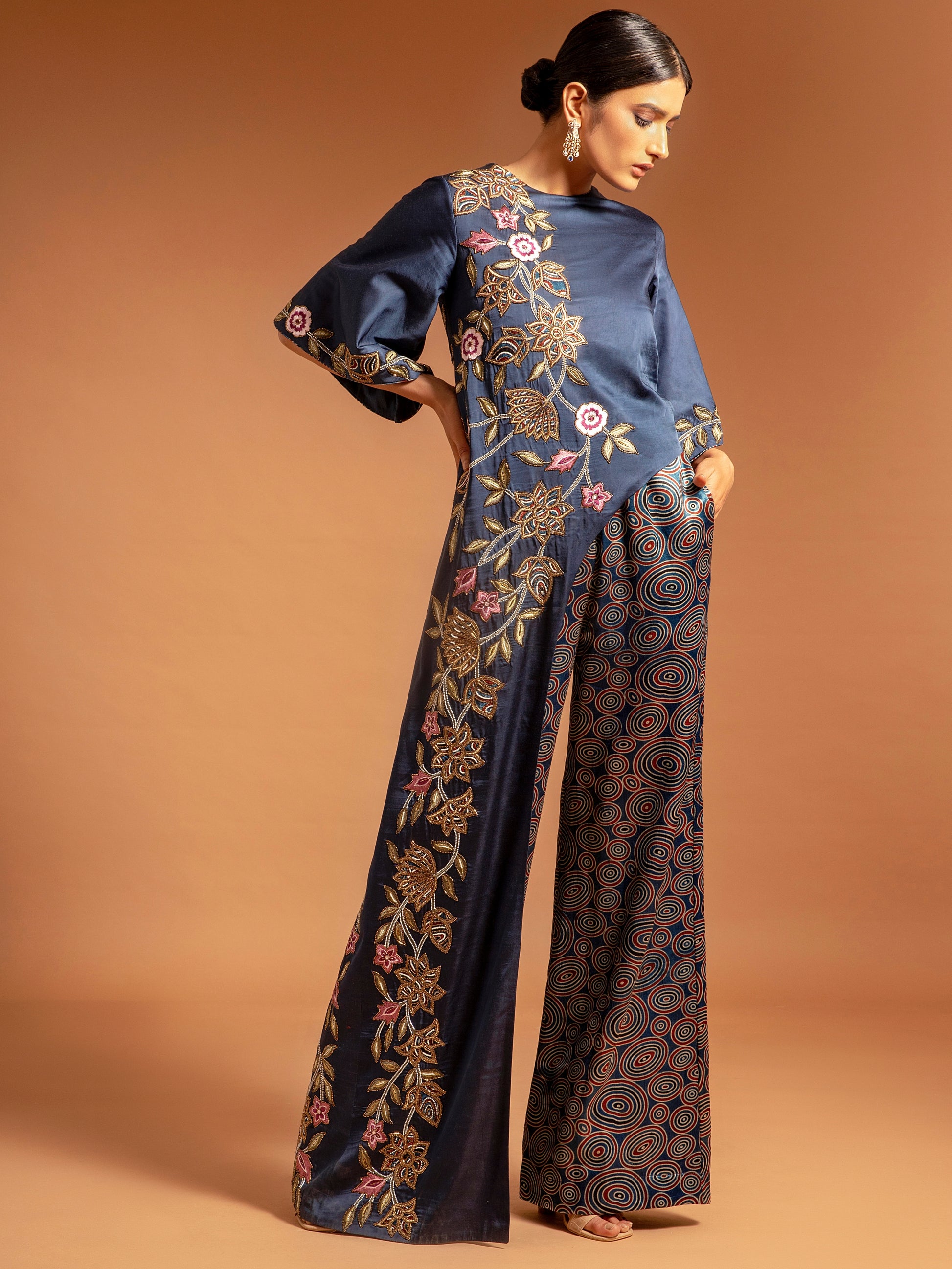Cobalt blue ajrakh patchworked jumpsuit in pure Ajrakh and Modal satin embellished with cutdana,moti and beadwork.