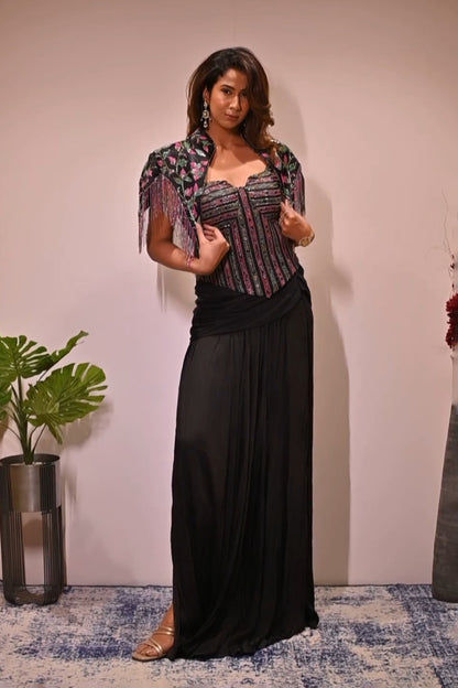 Nikki Deol in Black Embellished Short Jacket and corset with Draped Skirt Set
