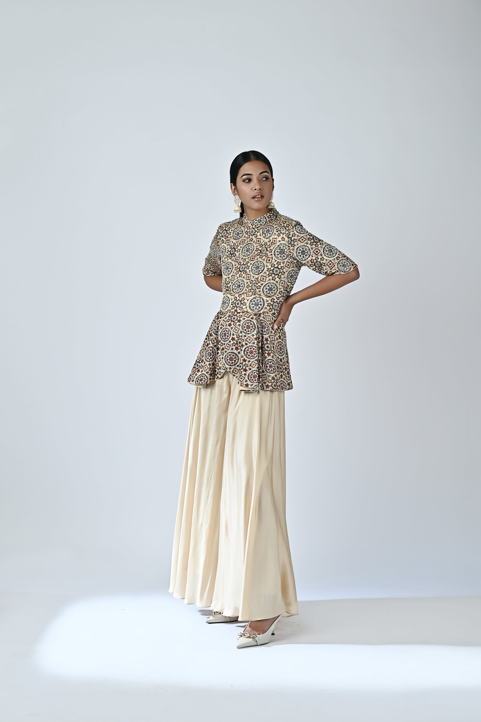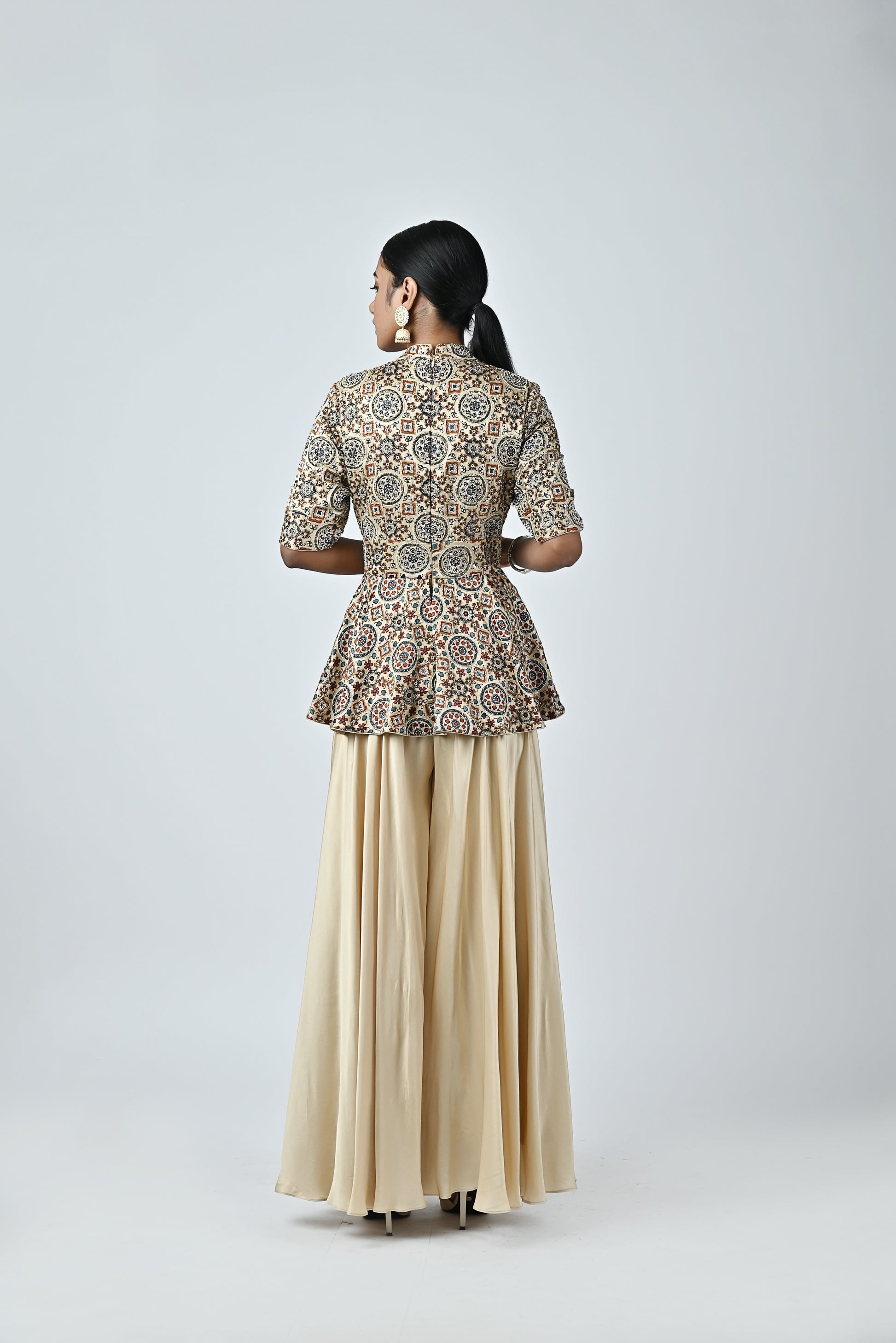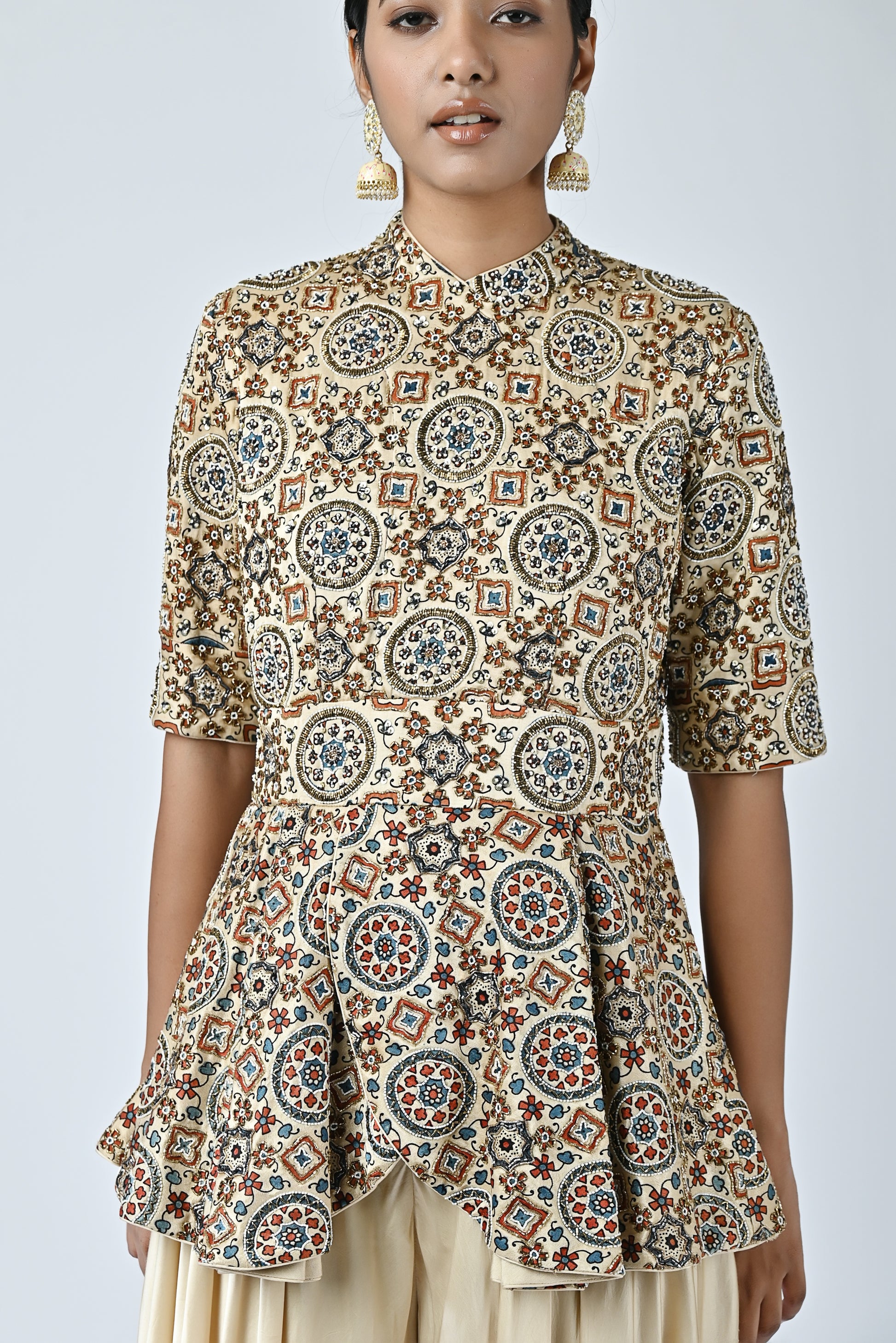 Featuring Ivory fully handcrafted ajrakh peplum jumpsuit embellished with cutdana, beadwork.