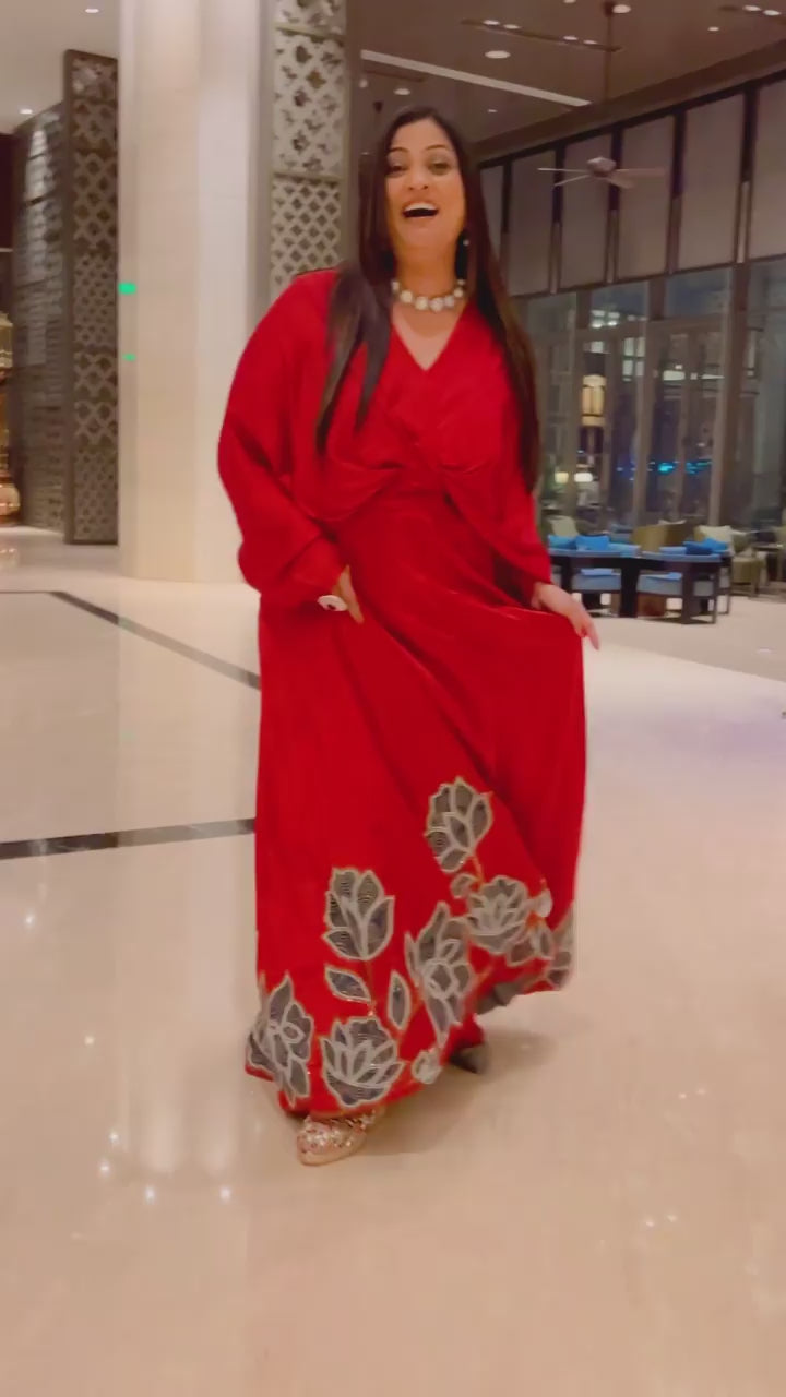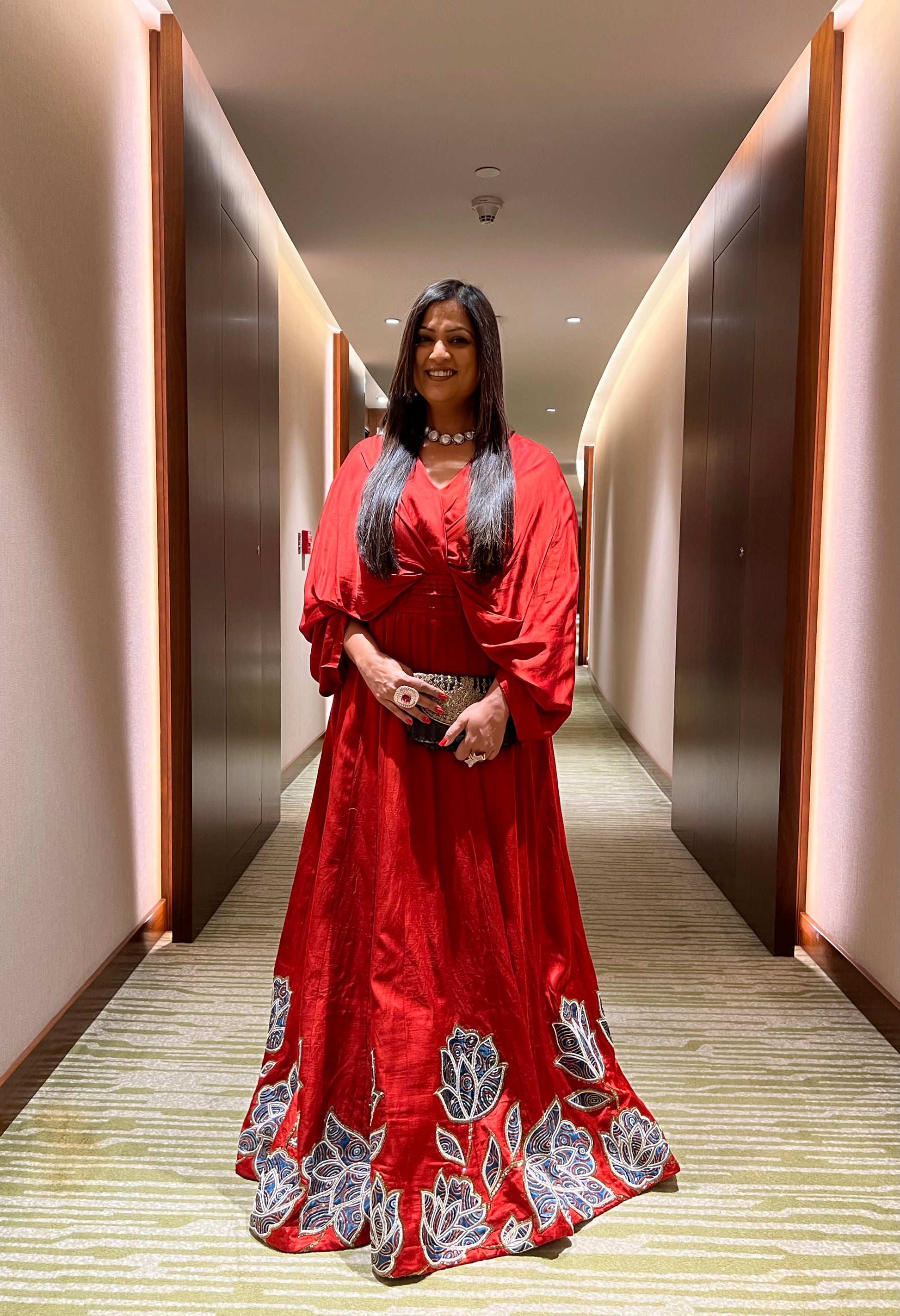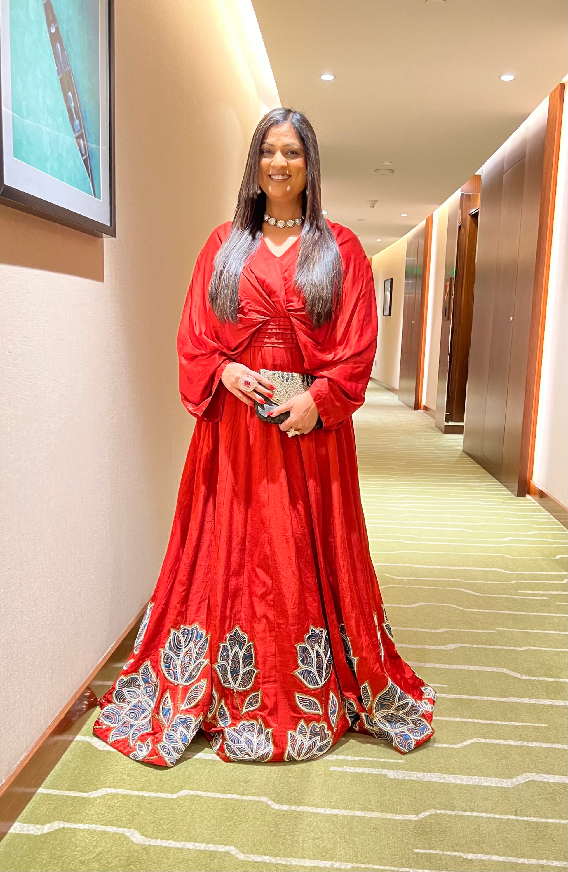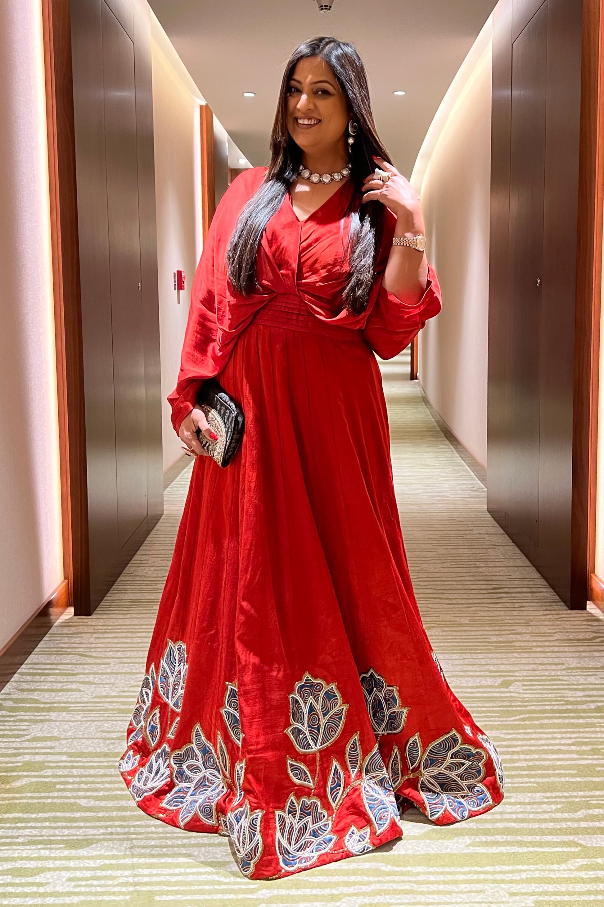 Richa Sharma in Red Poncho sleeve patchworked Gown with Belt