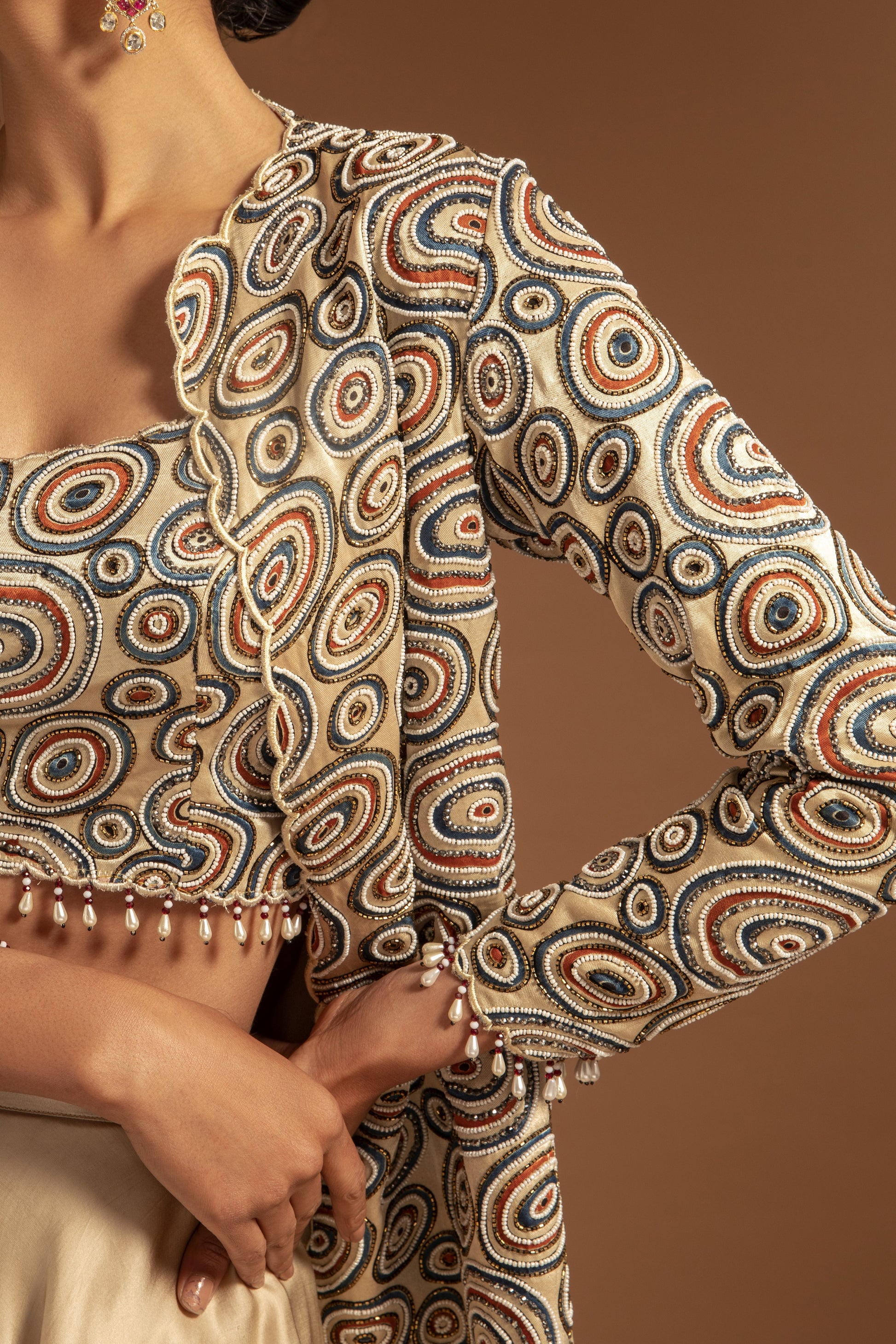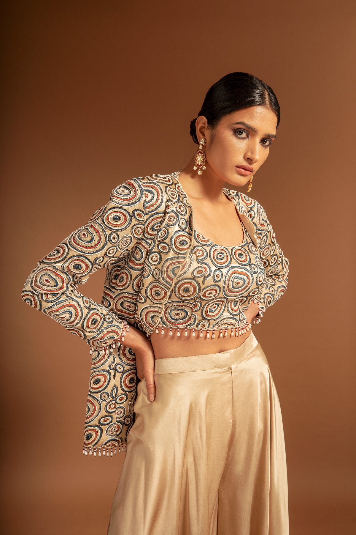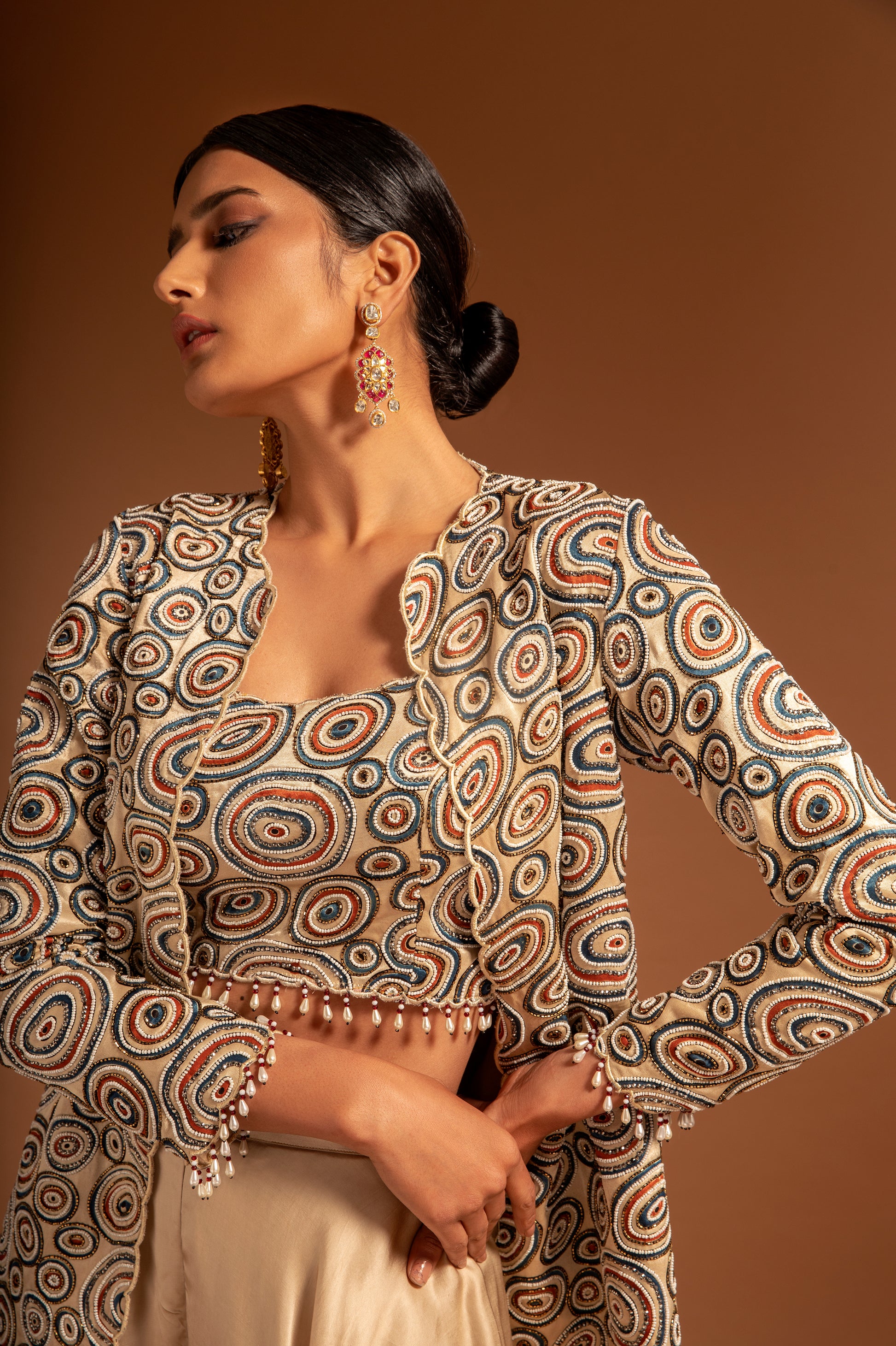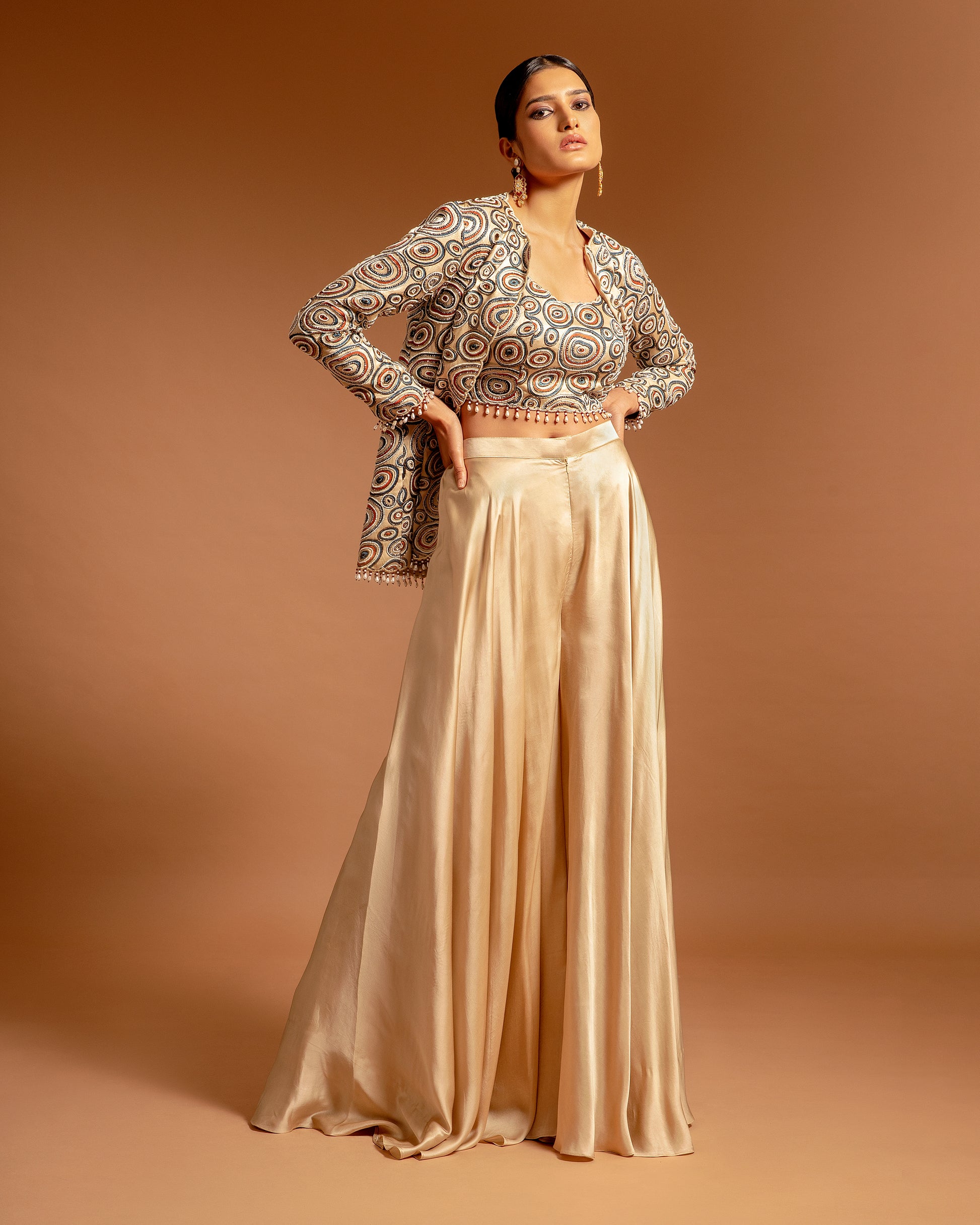Beige full sleeve front open jacket, highlighted with all over ajrak pattern, embellished with cut dana and beads embellishments. Paired with an inner blouse with all over ajrak pattern & cut dana embellishments and flared pant.