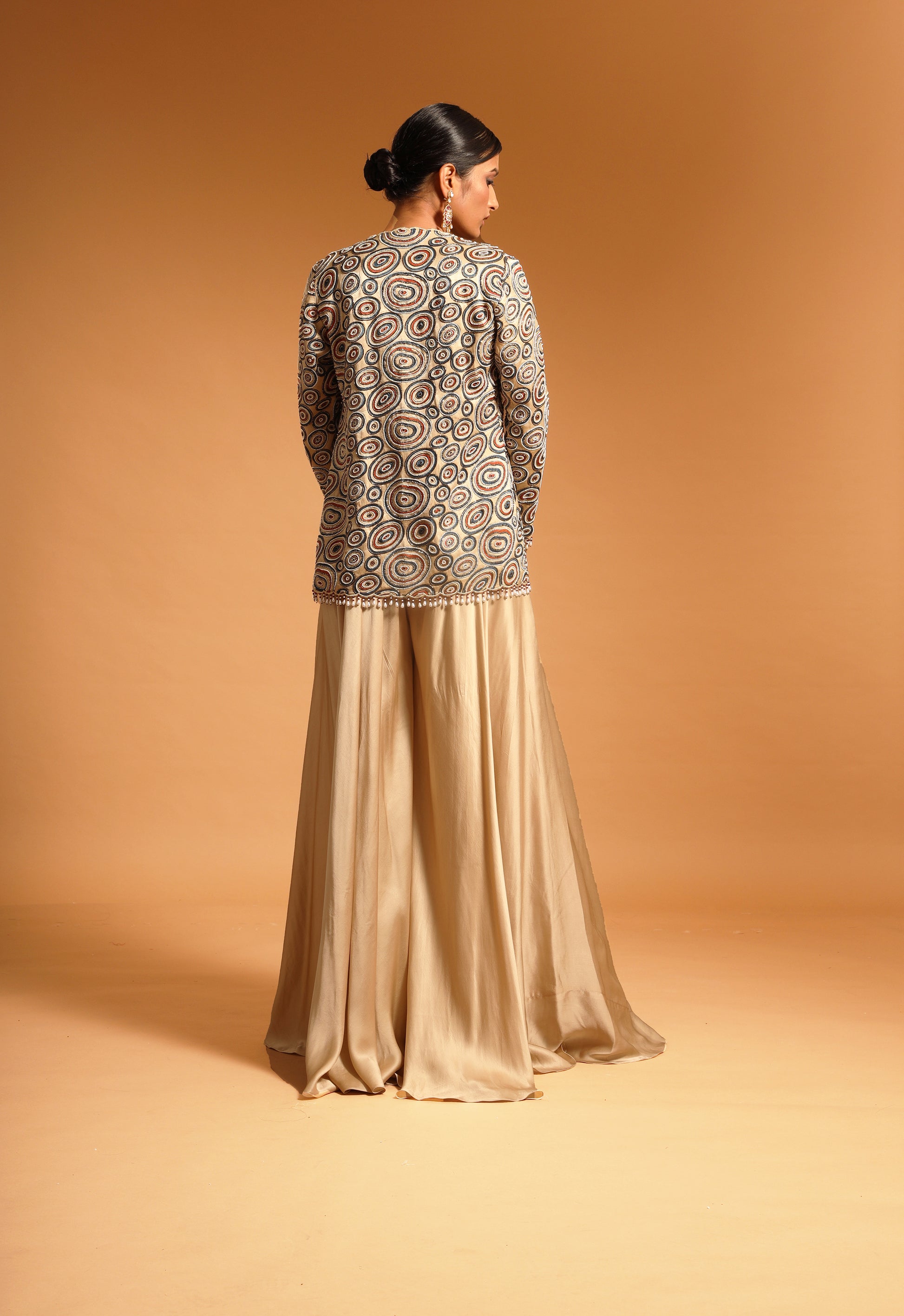 Beige Embellished Jacket And Flared Pant Set