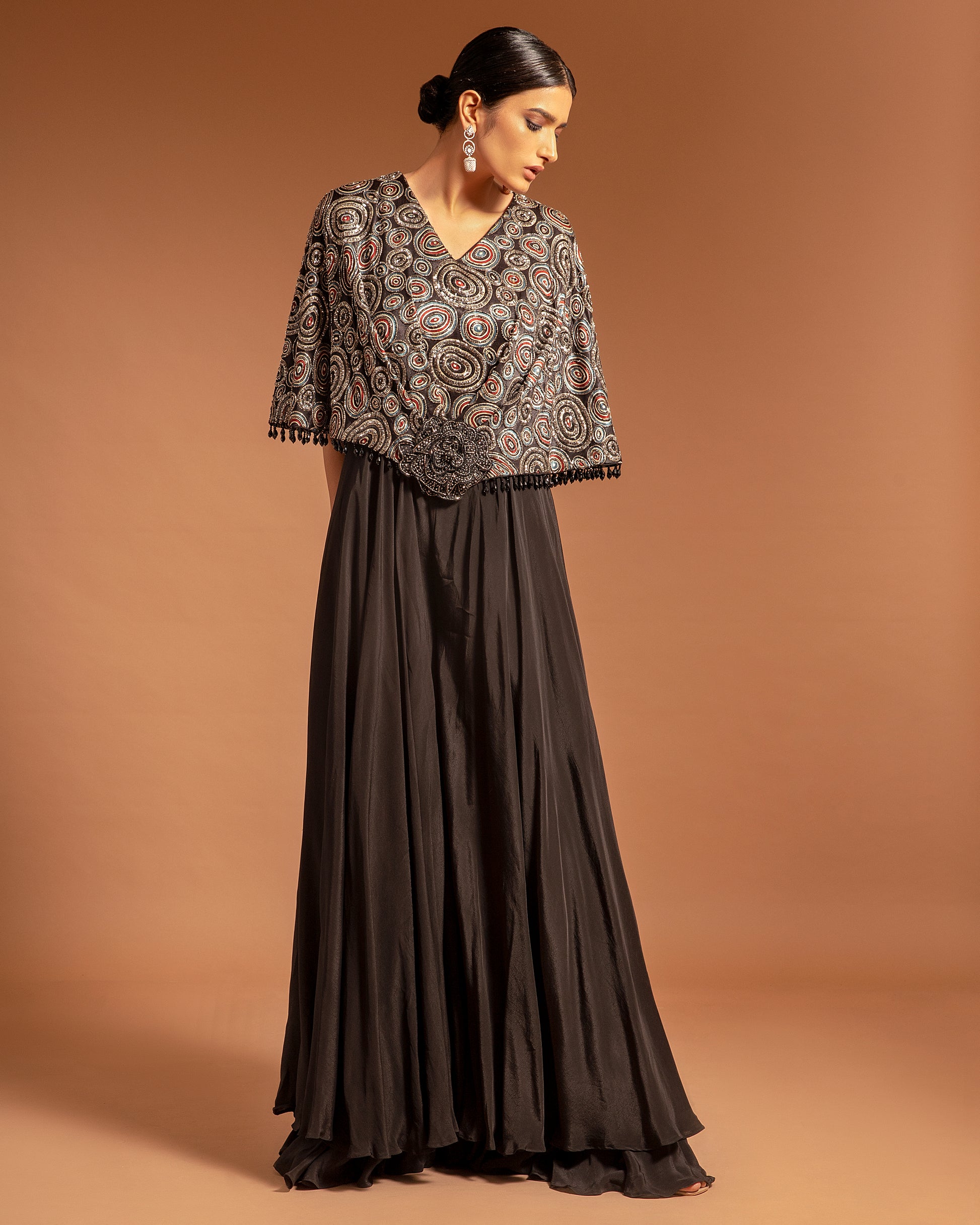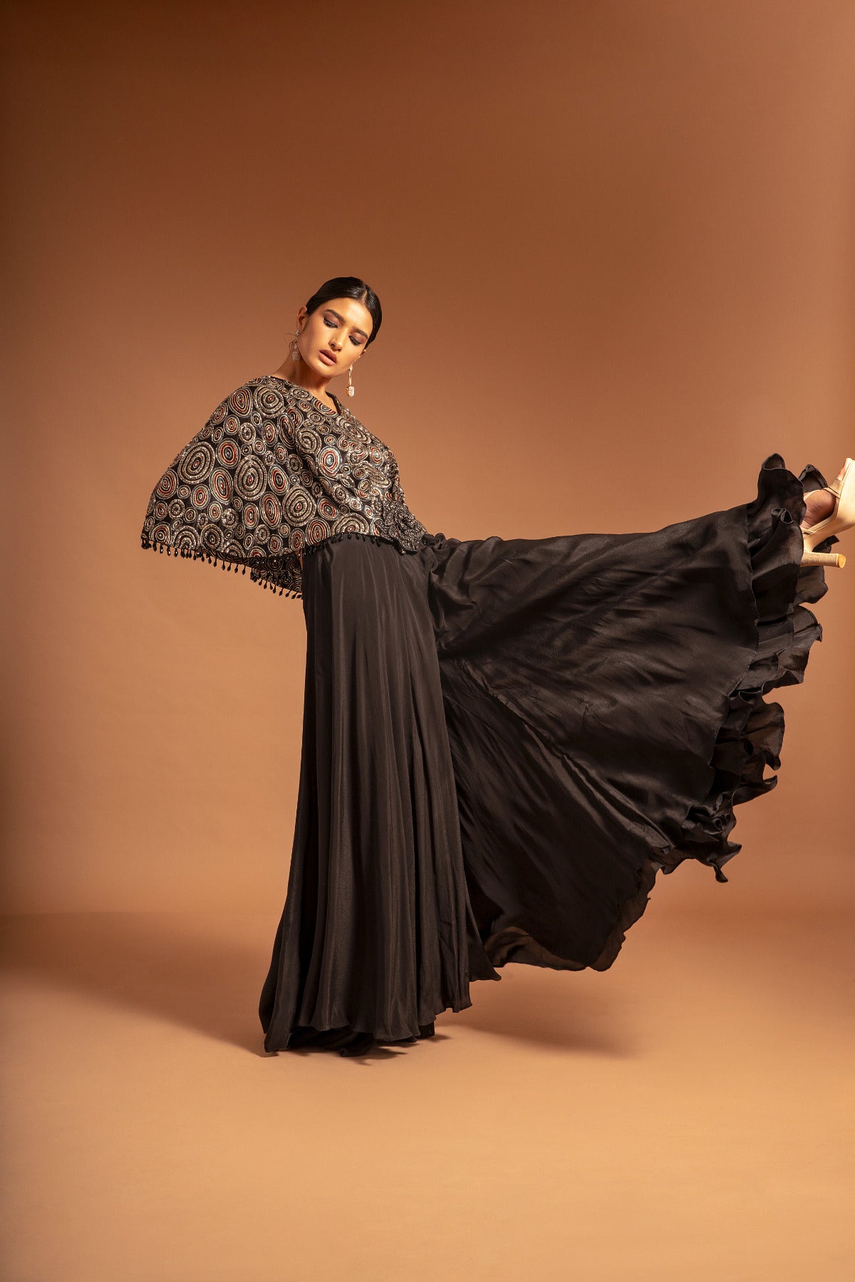 Black layered jumpsuit with Ajrakh print and cutdana embroidery on the flap, a 3D floral embellished brooch on the waist and bead drops.